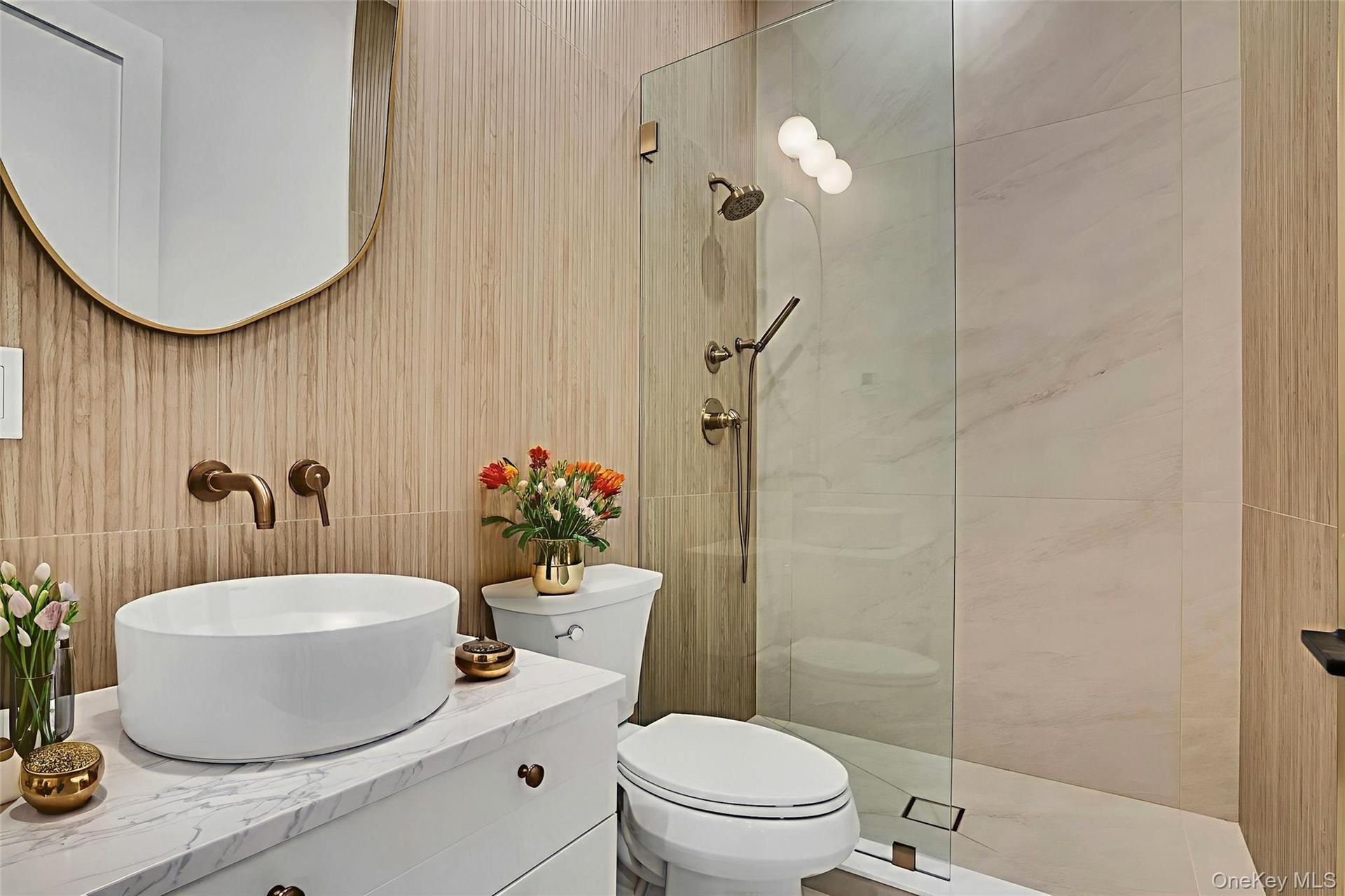 - Full bathroom featuring a marble finish shower, double vanity, a freestanding tub, and recessed lighting