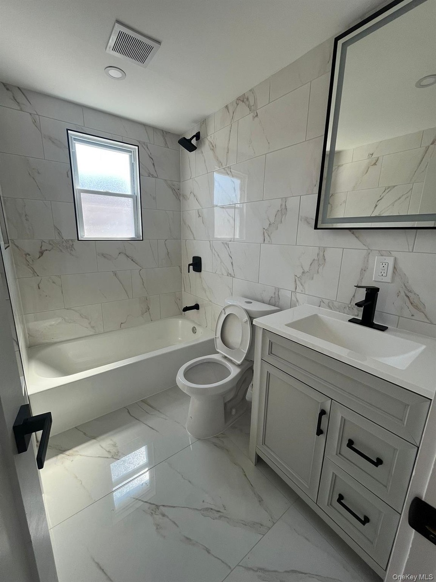 - Bathroom with tile walls, vanity, shower / bathtub combination, and marble finish flooring