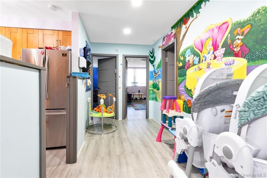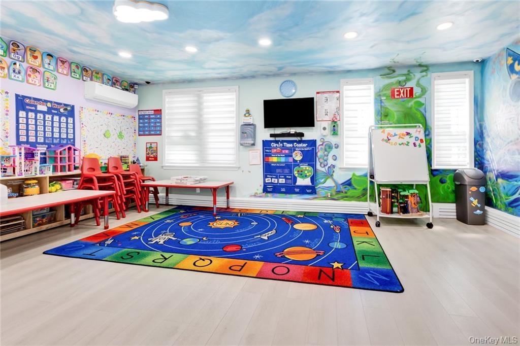 - Rec room featuring wood finished floors, recessed lighting, and a wall mounted AC