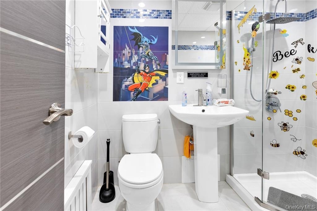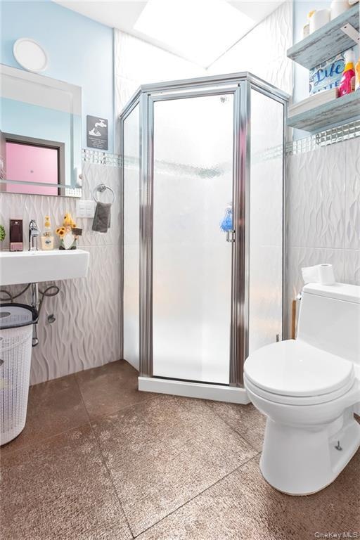 - Bathroom with a stall shower, tile walls, and wood finished floors