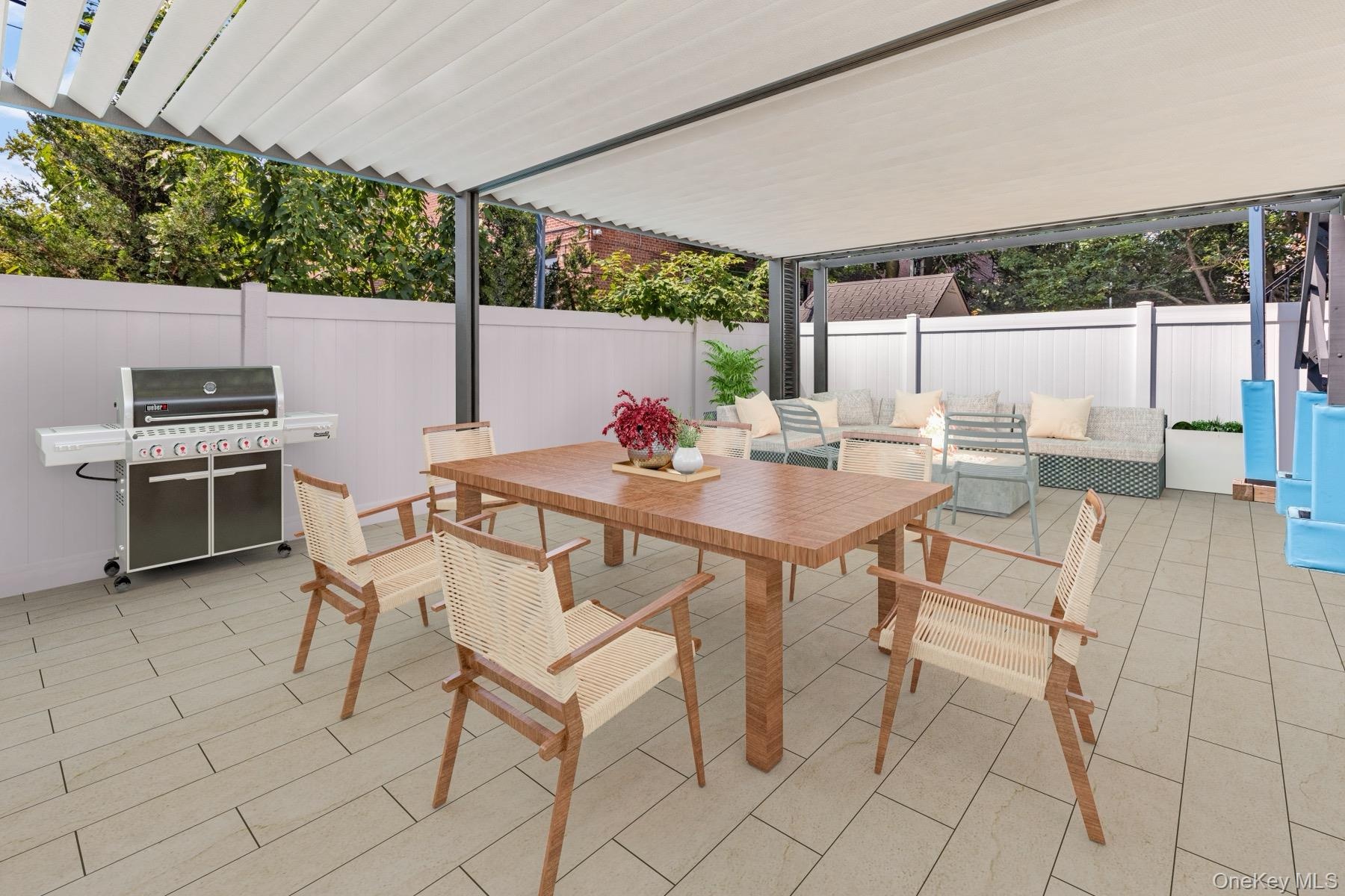 - Fenced backyard featuring a grill, outdoor dining space, outdoor lounge area, a patio area, and a pergola