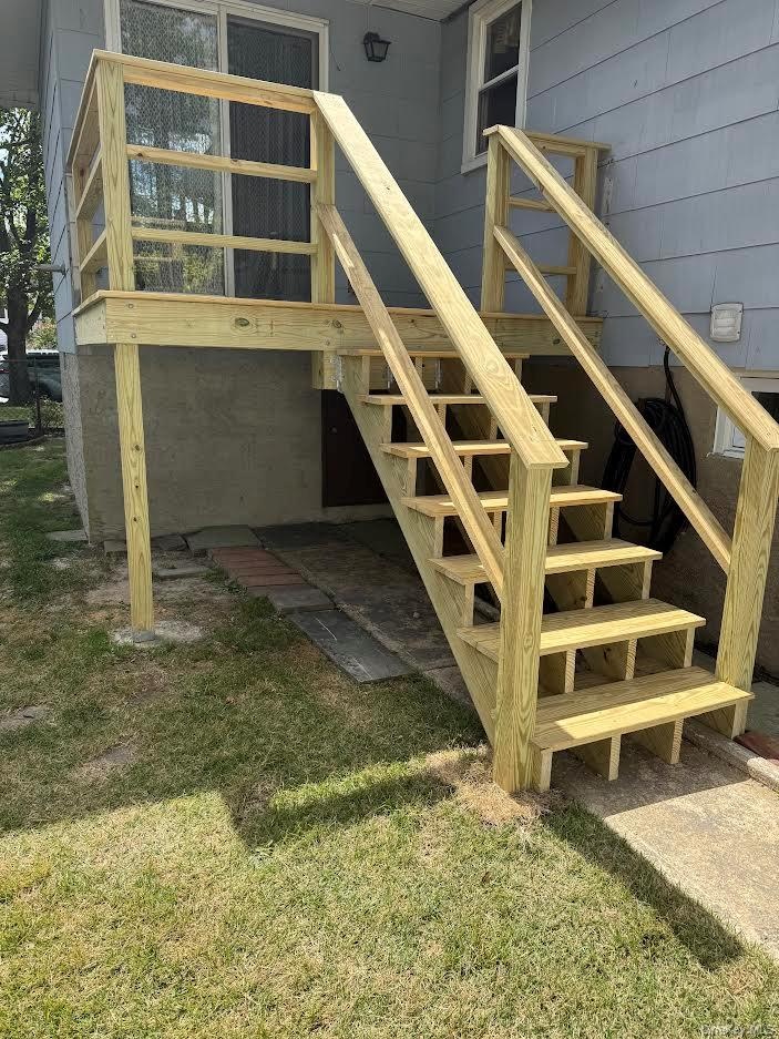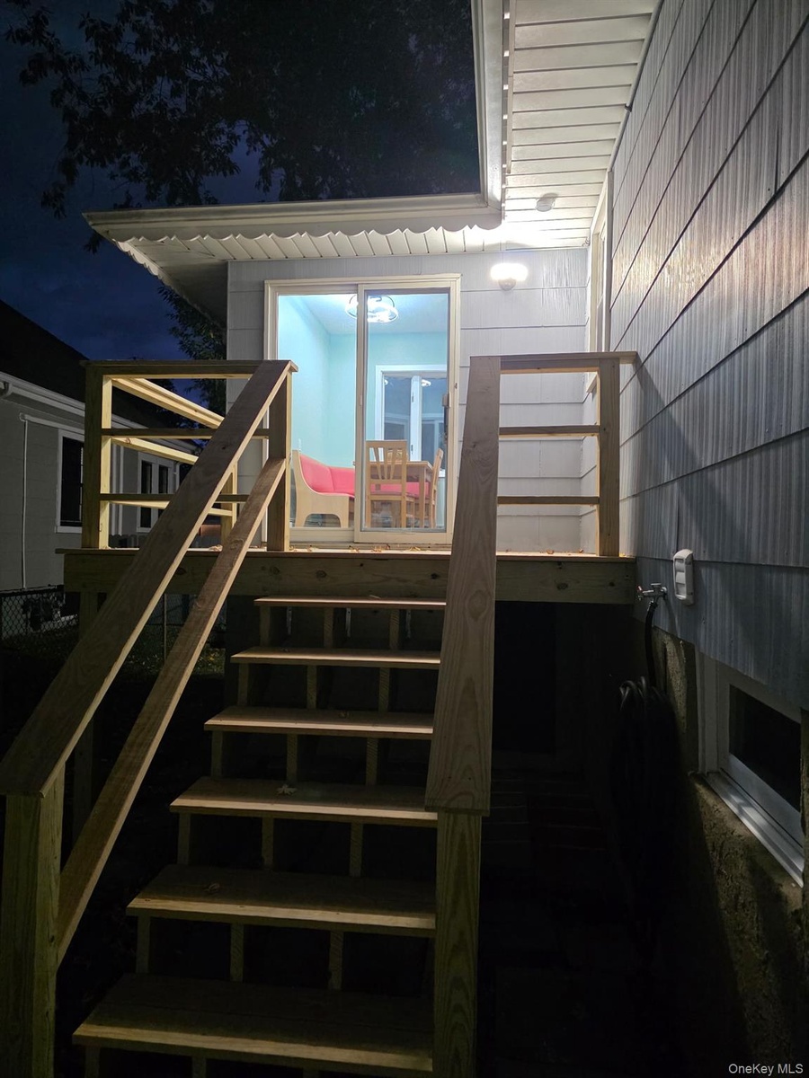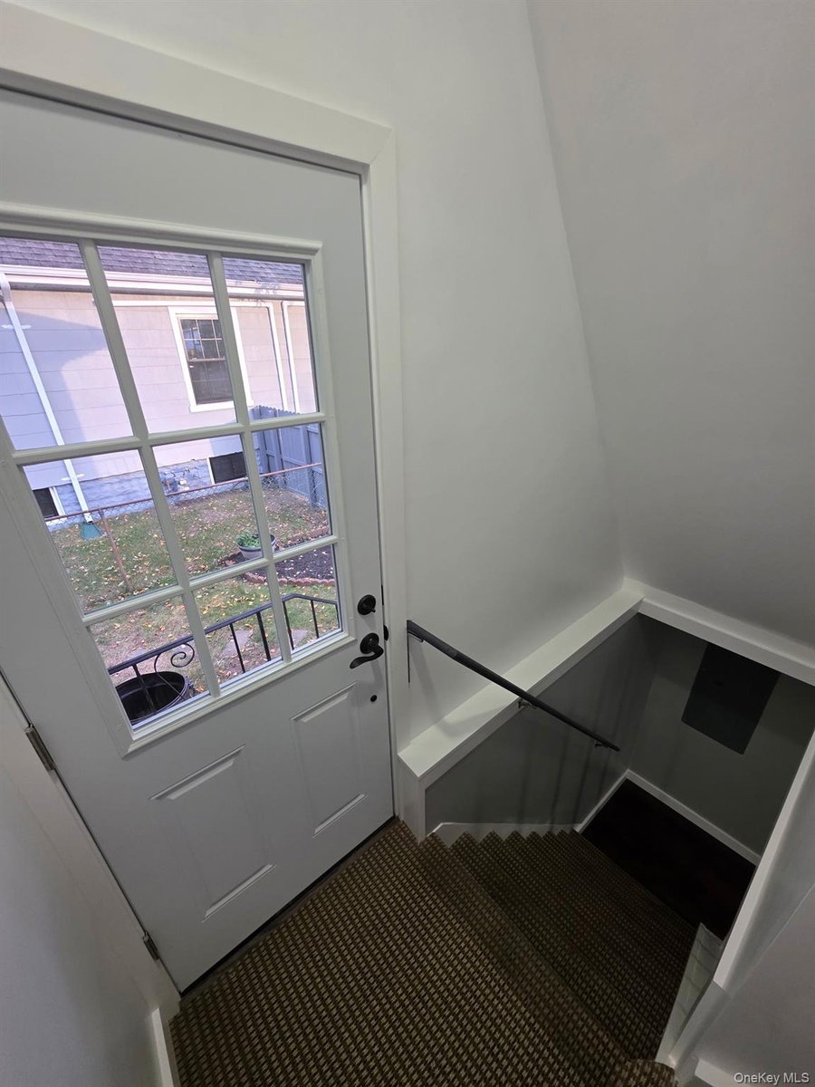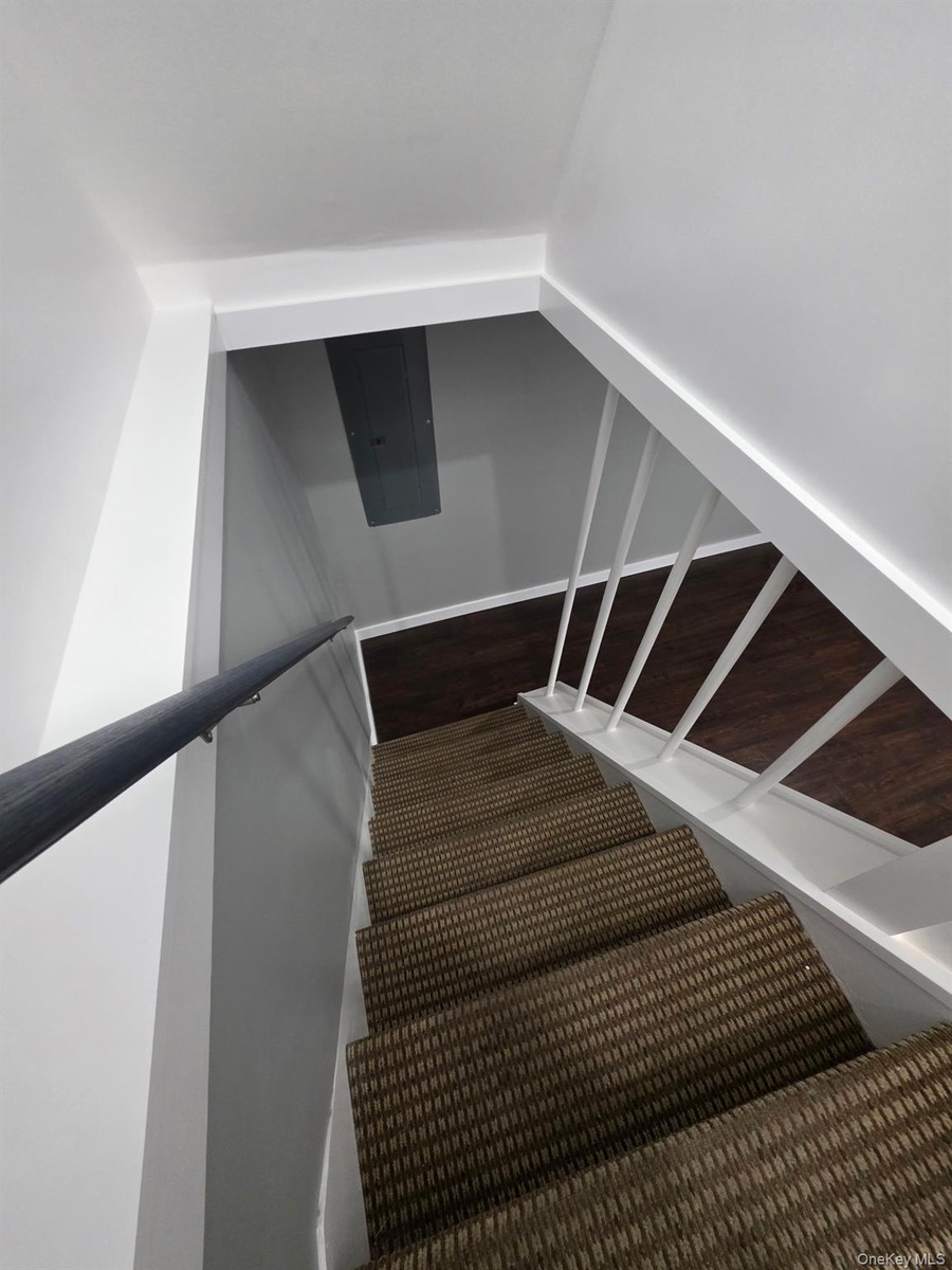 - Finished below grade area with dark wood-type flooring, electric panel, and stairs