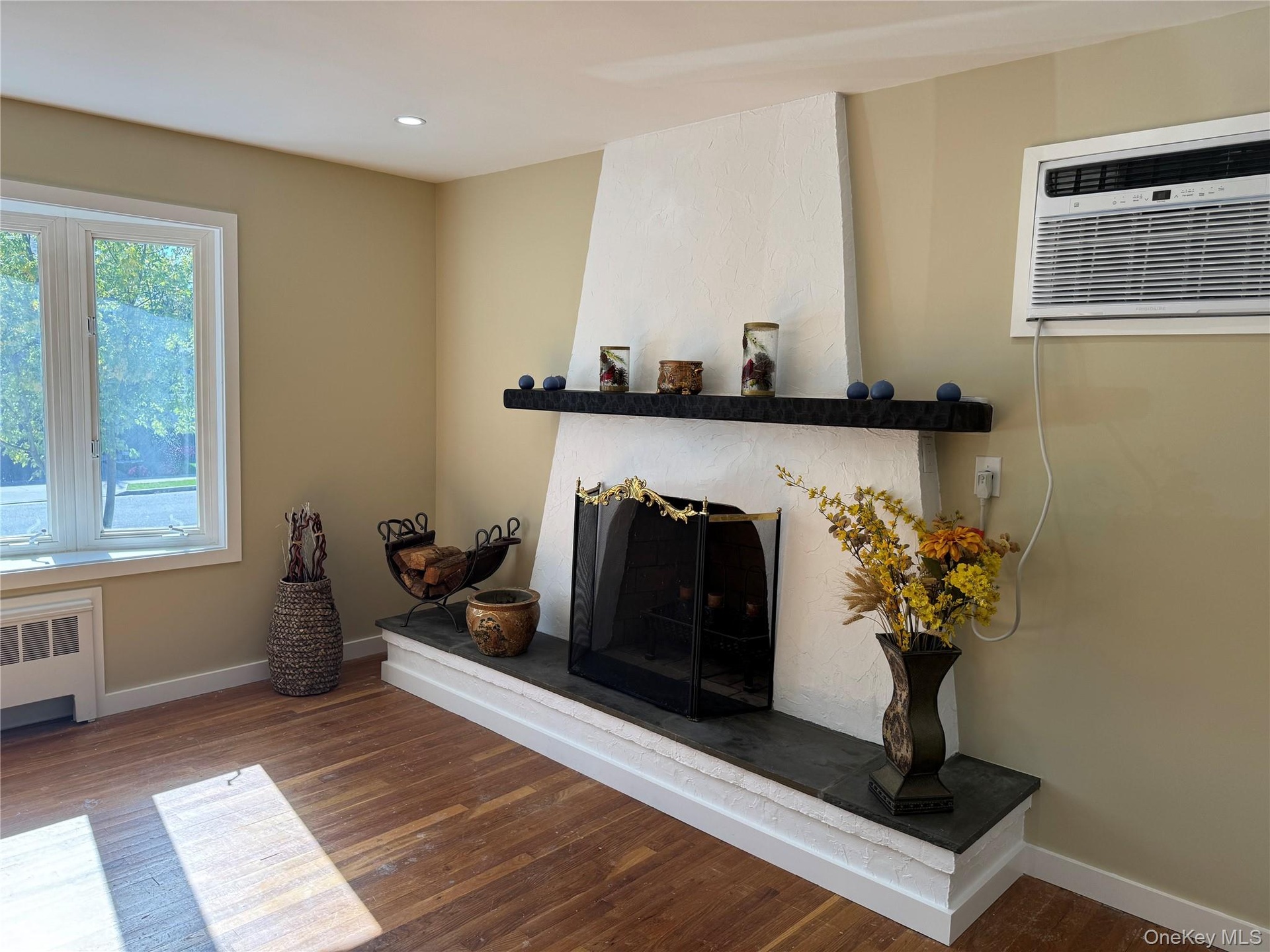 - Living room with dark wood finished floors, a large fireplace, radiator heating unit, a wall mounted air conditioner, and recessed lighting