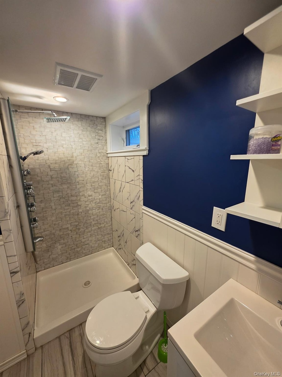 - Full bathroom featuring a stall shower, a wainscoted wall, vanity, and wood finished floors