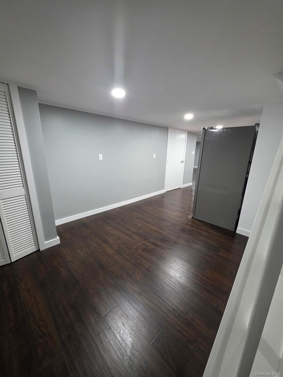 - Basement featuring freestanding refrigerator and dark wood-style flooring