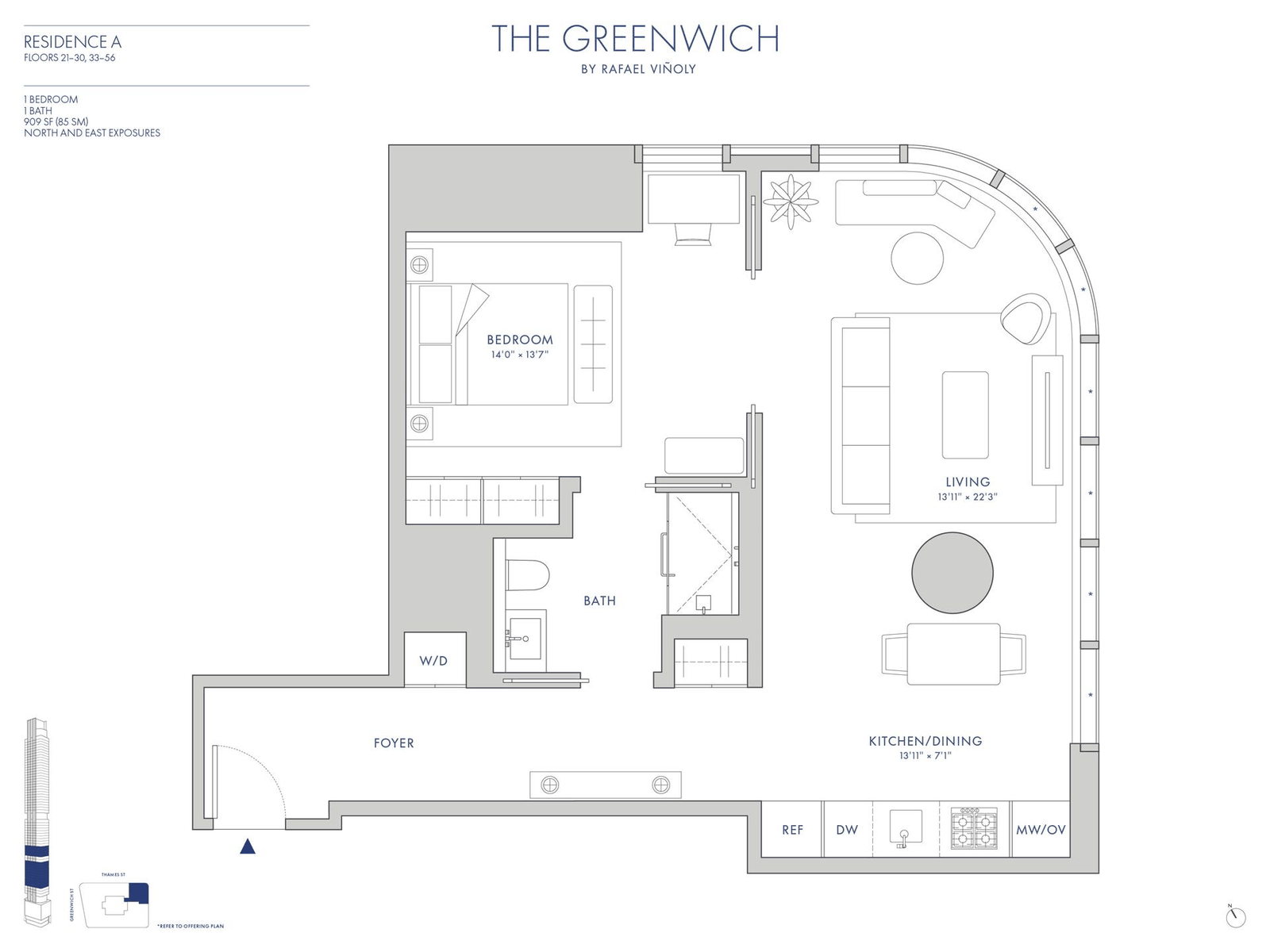 The complete offering terms are in an offering plan available from Sponsor. Sponsor: 125 Greenwich Owner LLC c/o: Fortress Investment Group LLC, 1345 Avenue of the Americas, 45th Floor New York, NY 10105. File no. CD15-0336. The artist representations and interior decorations, finishes, appliances and furnishings are provided for illustrative purposes only. All residential units are sold unfurnished. Sponsor makes no representations or warranties except as may be set forth in the offering plan. Sponsor reserves the right to substitute materials, appliances, equipment, fixtures and other construction and design details specified herein with similar materials, appliances, equipment and/or fixtures of substantially equal or better quality. All dimensions are approximate and subject to normal construction variances and tolerances. Square footage exceeds the usable floor area. Sponsor reserves the right to make changes in accordance with the terms of the offering plan. Plans and dimensions may contain minor variations from floor to floor. All dimensions and ceiling heights are approximate. Equal housing opportunity.