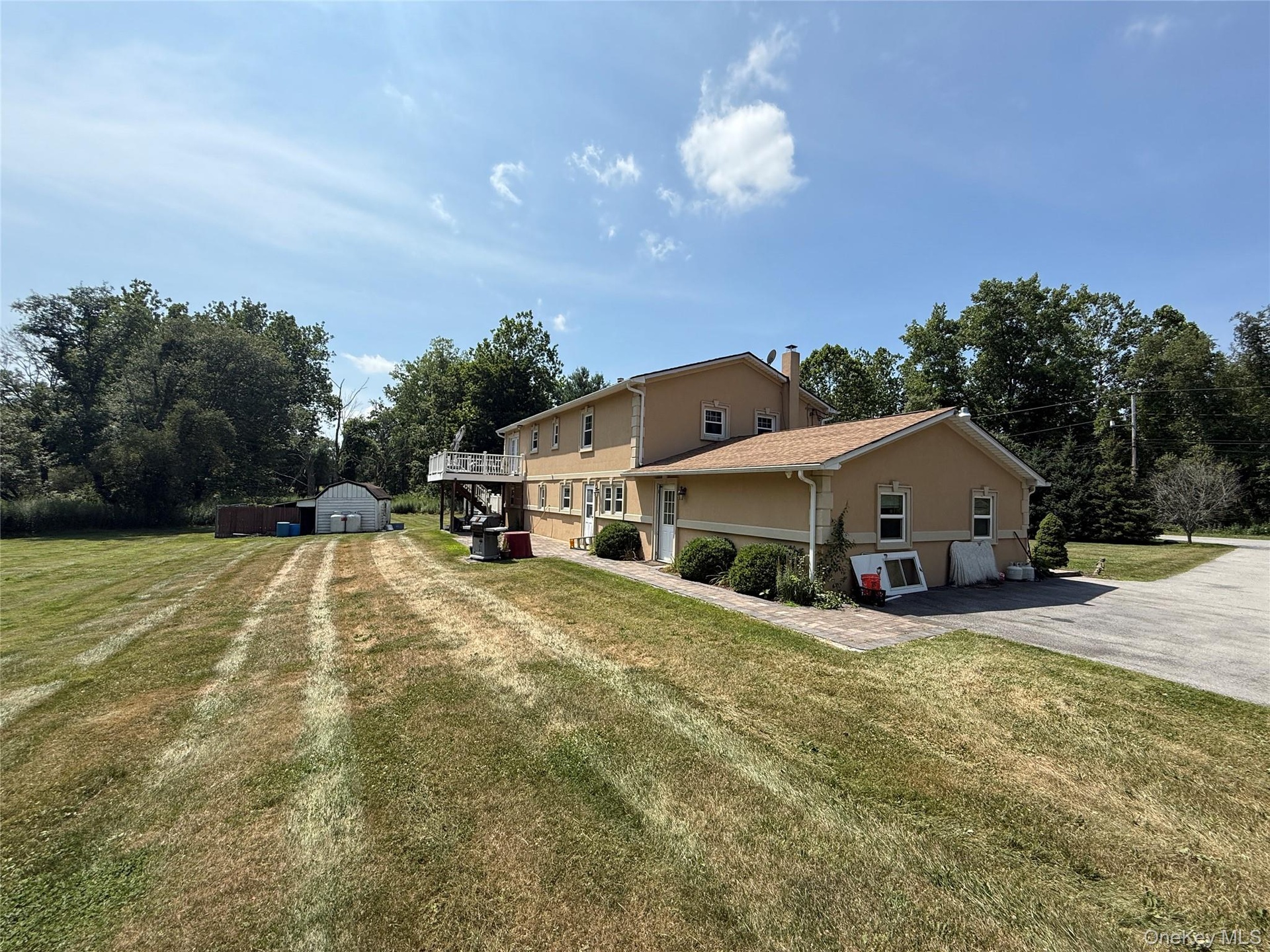 - View of side of home with stucco siding, a storage shed, a lawn, and driveway