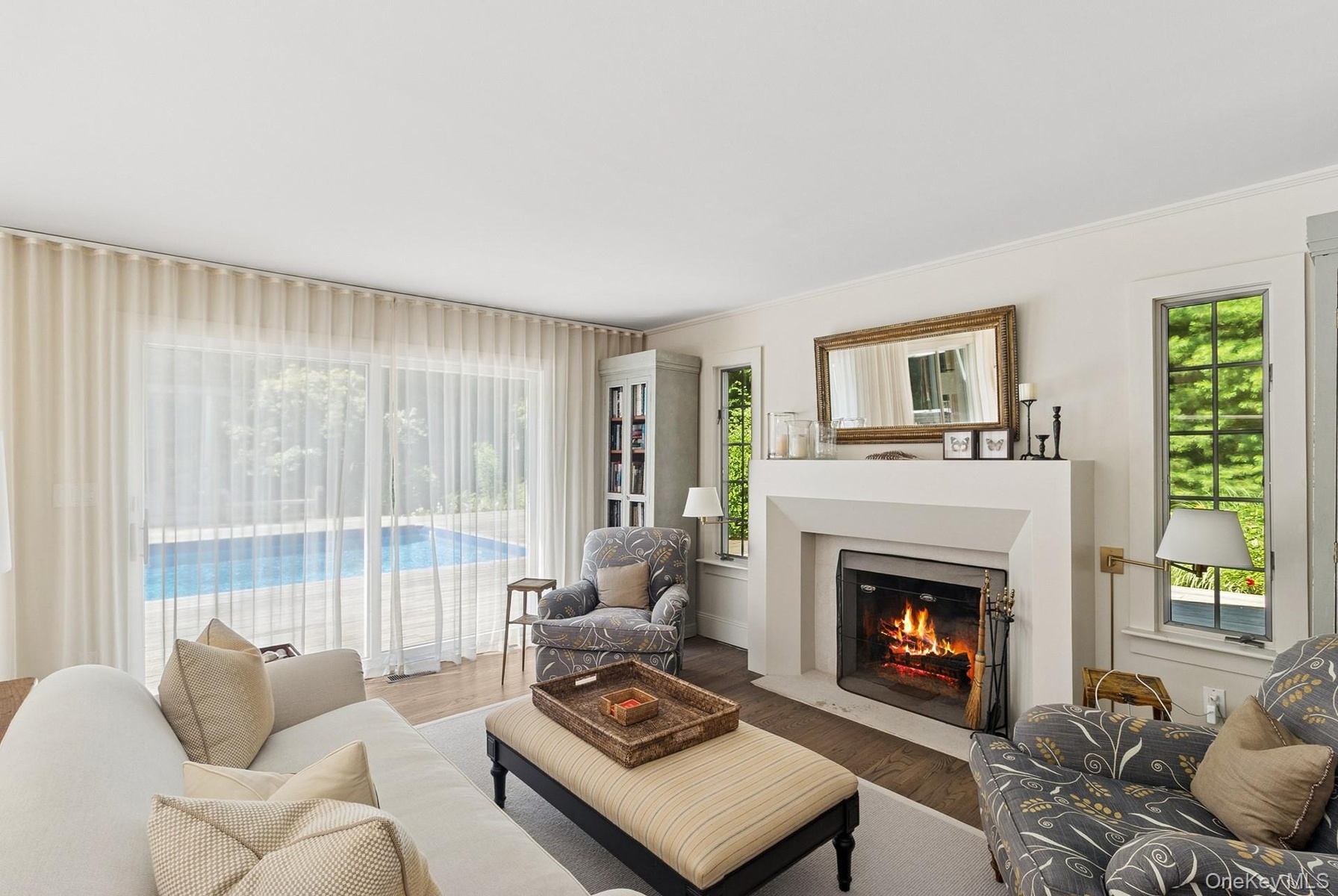 - Living room featuring wood finished floors, healthy amount of natural light, and a fireplace with flush hearth