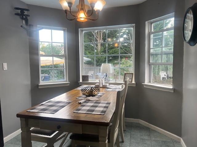 - Tiled dining room featuring a chandelier and plenty of natural light