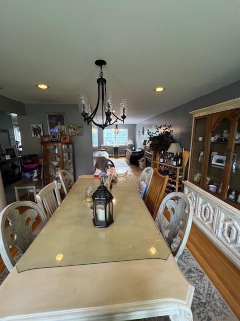 - Dining room featuring wood finished floors, a chandelier, and recessed lighting