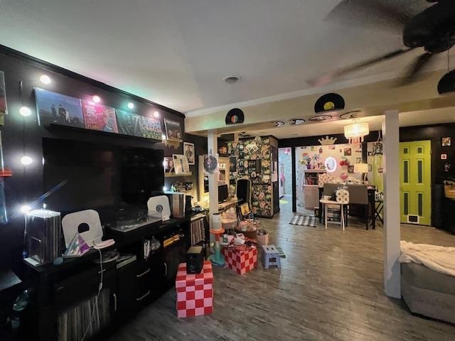 - Living area with wood finished floors, crown molding, and a ceiling fan