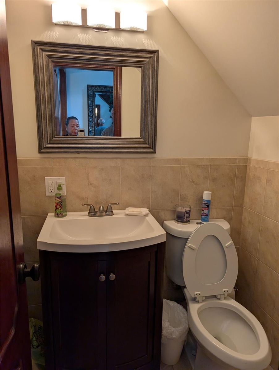 - Half bathroom with vanity, tile walls, lofted ceiling, and wainscoting