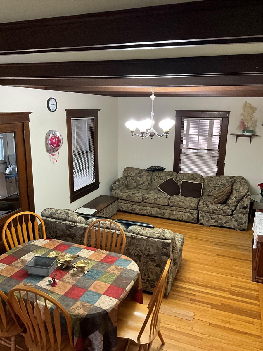 - Living room with light wood-type flooring, a chandelier, and beam ceiling