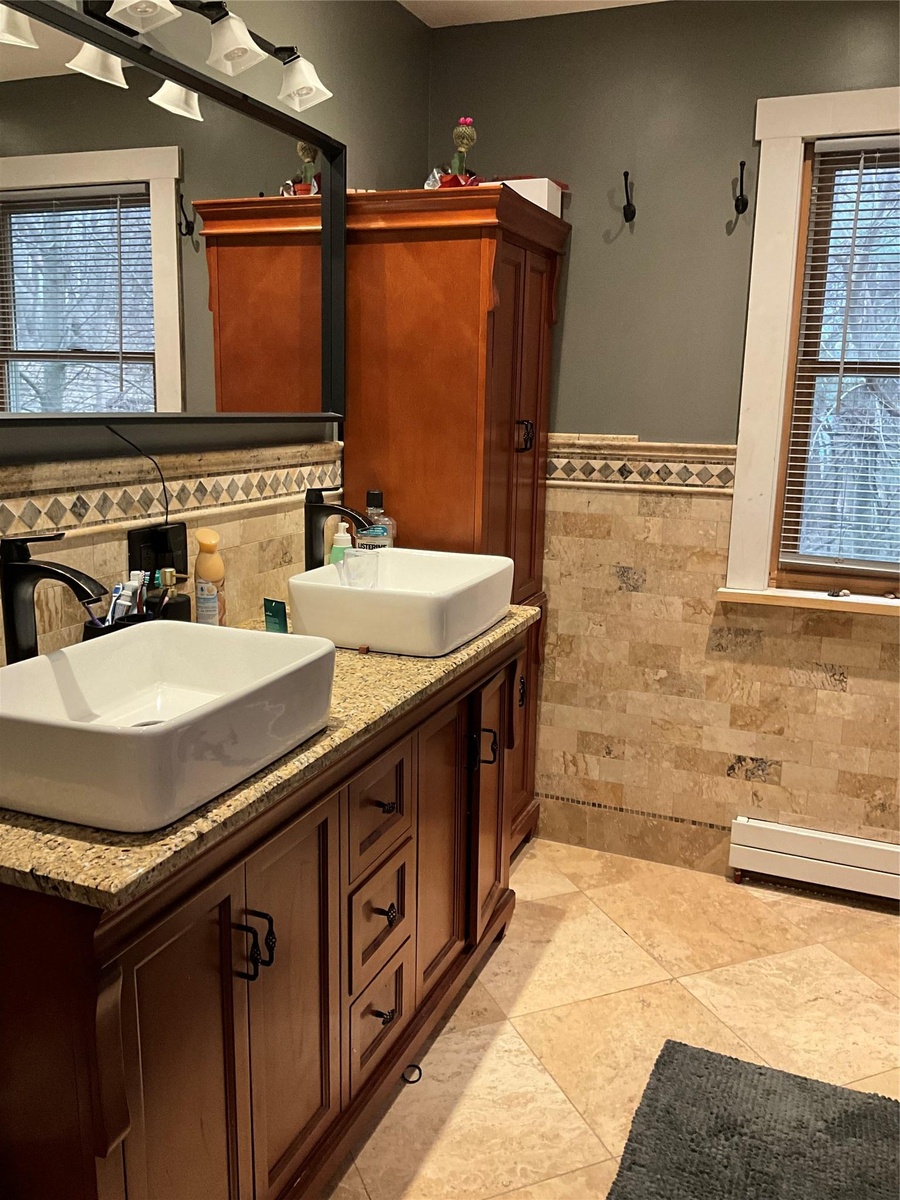 - Bathroom with a wainscoted wall, tile walls, baseboard heating, double vanity, and tile patterned flooring