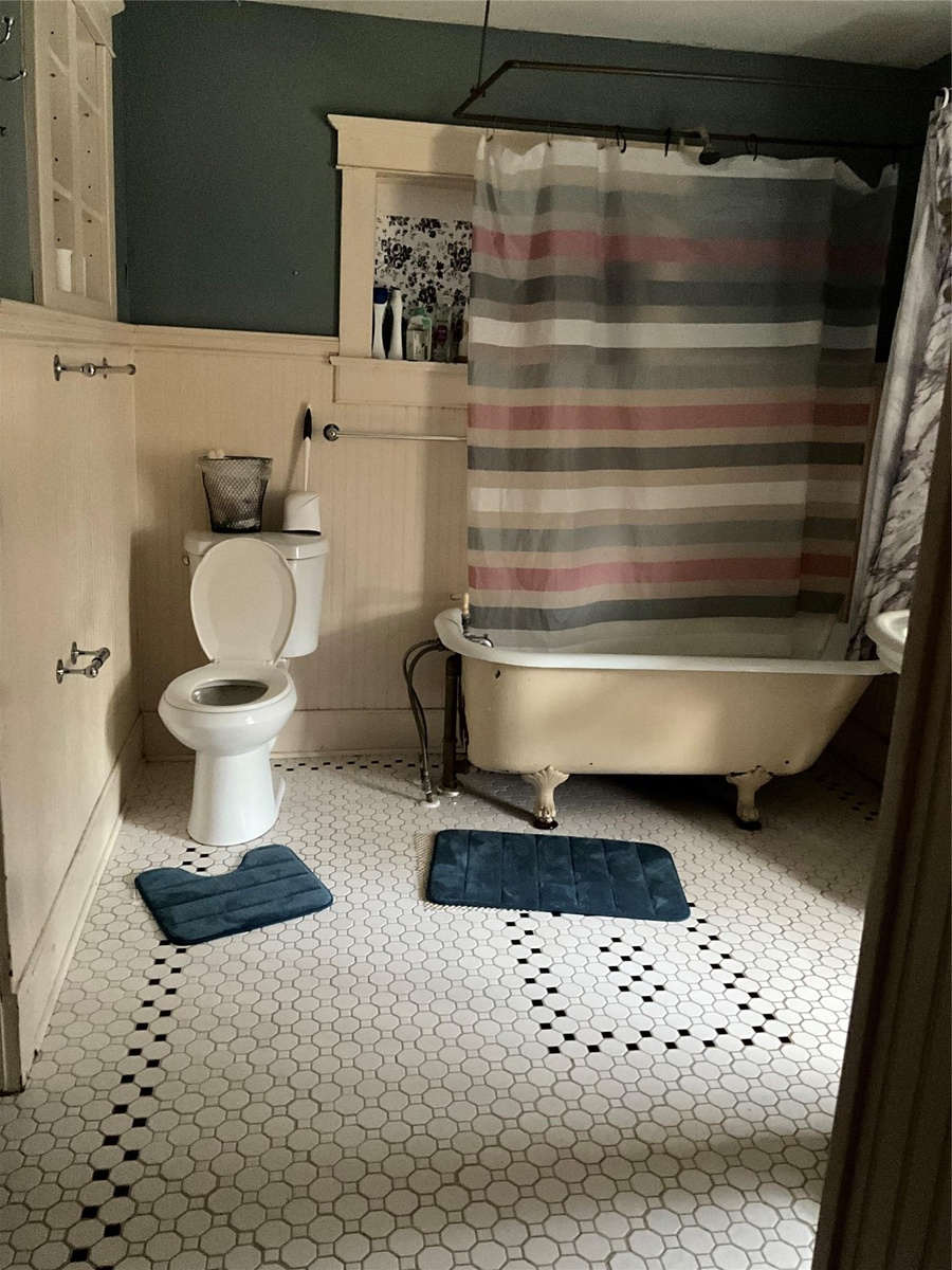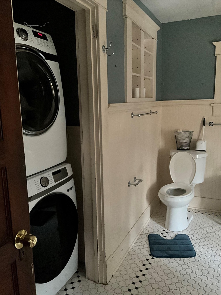 - Bathroom featuring stacked washer / drying machine, wainscoting, and tile patterned flooring