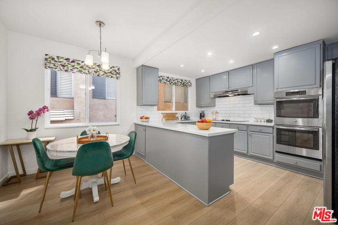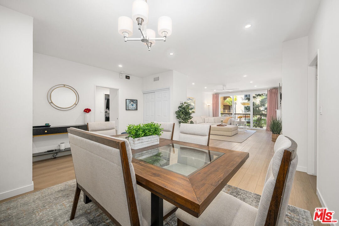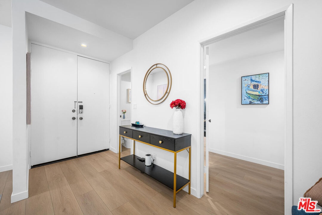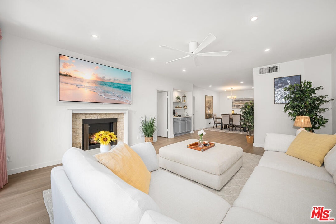 Beautifully remodeled and spacious 2-bedroom, 3-bath corner unit in the highly sought-after Westwood Marquis. Offering over 1,750 sq ft of single-level living, this residence blends luxury and convenience with high ceilings, recessed lighting, and abundant natural light. A formal entry leads to a generous living room with stack-stone fireplace, built-in bar, and floor-to-ceiling sliding glass doors opening to a private covered balcony. The updated kitchen features white cabinetry, quartz countertops, stainless steel appliances, and a breakfast nook. Bedrooms are thoughtfully positioned on opposite sides for privacy, each with its own ensuite bath. The primary suite includes a large walk-in closet and spa-like bath with soaking tub and glass-enclosed shower. Additional highlights include in-unit side-by-side laundry, central HVAC, smart home integration, remote window treatments, two side-by-side garage spaces with EV charger, and extra storage. The secure building offers resort-style amenities including pool, spa, sauna, and club room, all moments from Westwood Village, UCLA, Sawtelle, and the best of West LA dining and shopping.