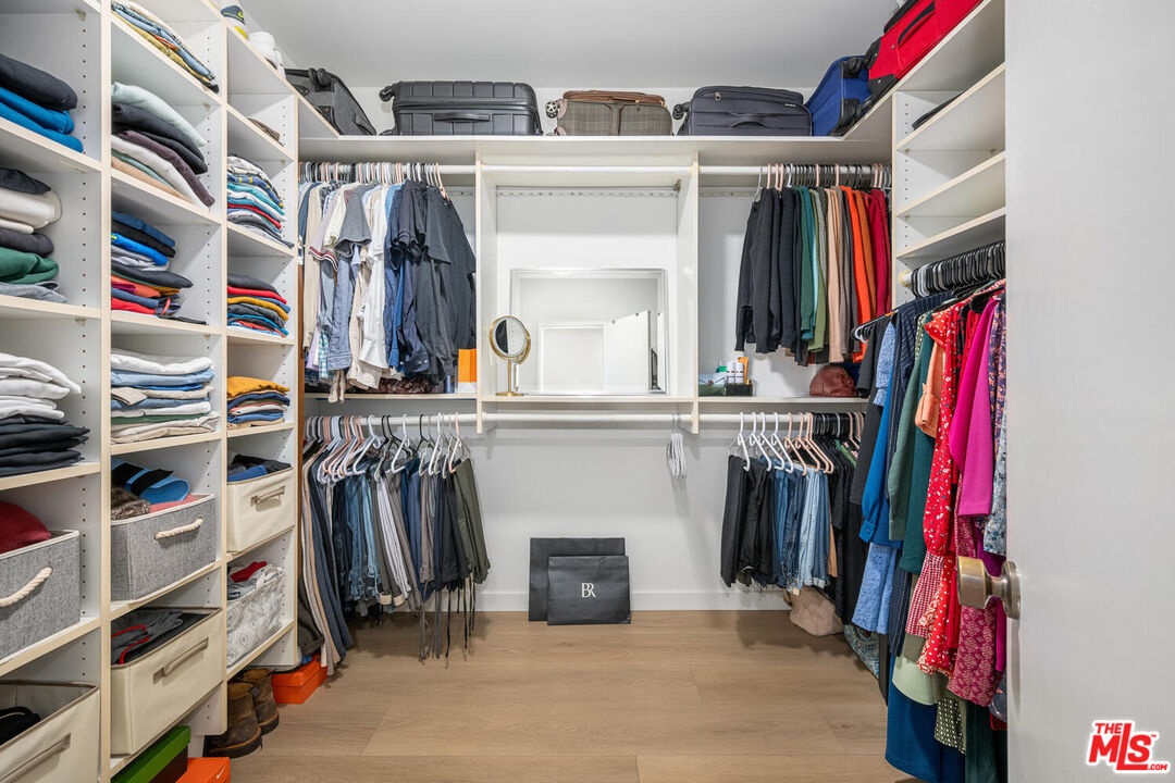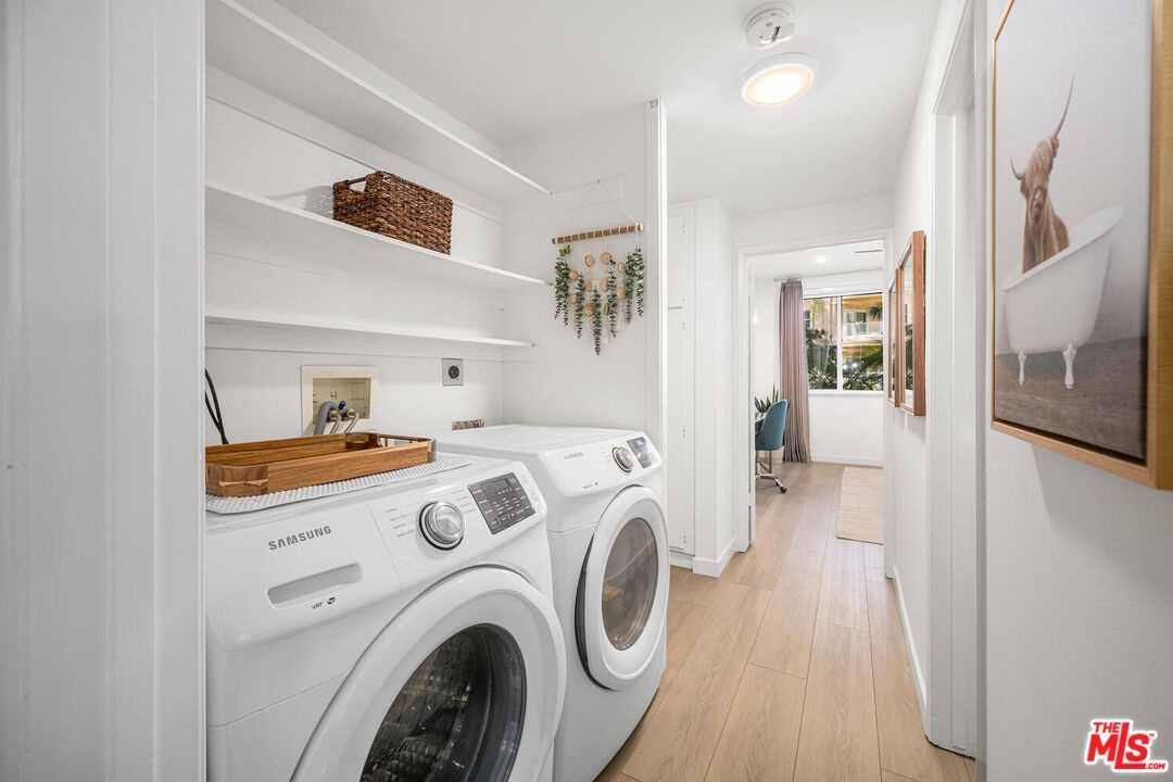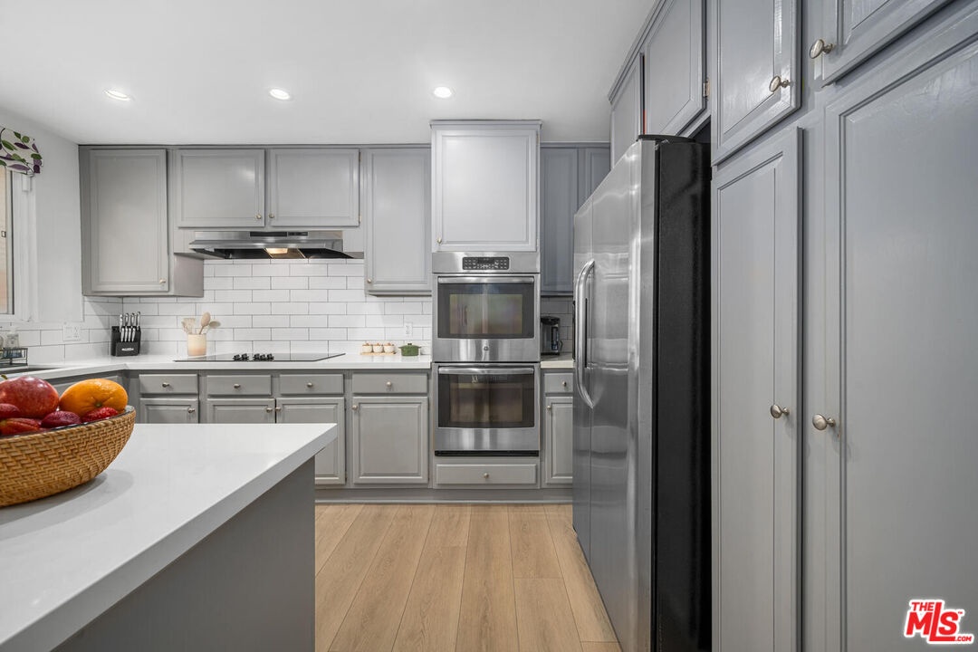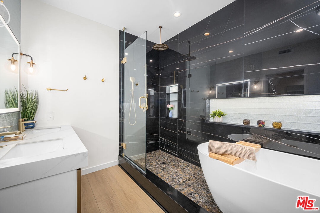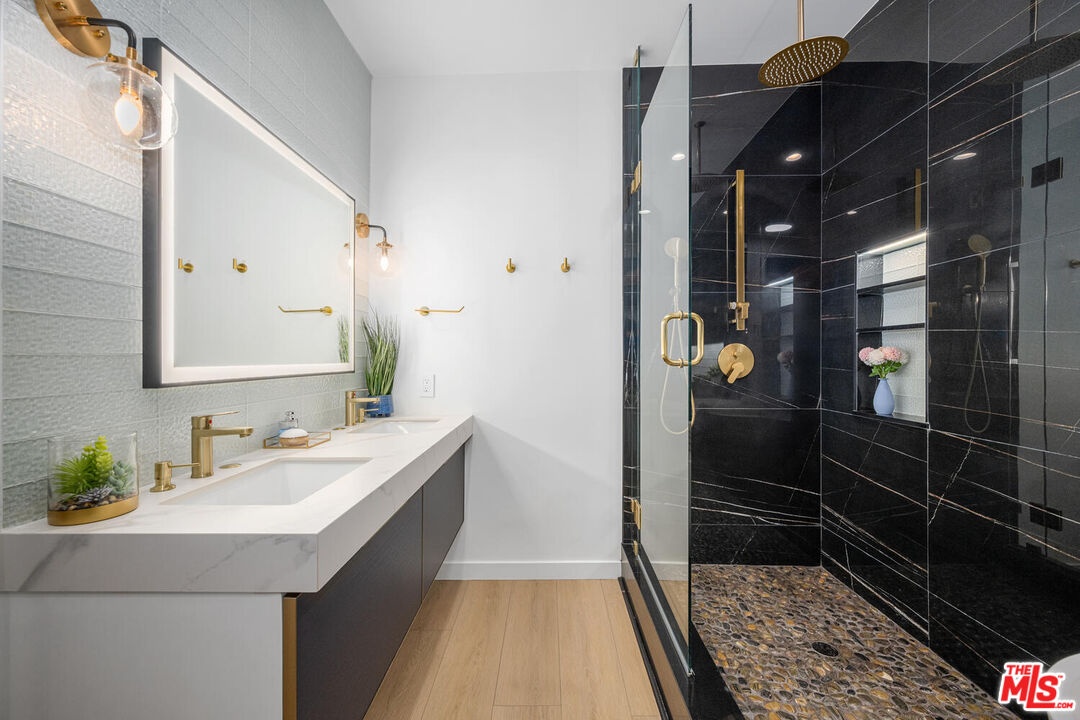 Beautifully remodeled and spacious 2-bedroom, 3-bath corner unit in the highly sought-after Westwood Marquis. Offering over 1,750 sq ft of single-level living, this residence blends luxury and convenience with high ceilings, recessed lighting, and abundant natural light. A formal entry leads to a generous living room with stack-stone fireplace, built-in bar, and floor-to-ceiling sliding glass doors opening to a private covered balcony. The updated kitchen features white cabinetry, quartz countertops, stainless steel appliances, and a breakfast nook. Bedrooms are thoughtfully positioned on opposite sides for privacy, each with its own ensuite bath. The primary suite includes a large walk-in closet and spa-like bath with soaking tub and glass-enclosed shower. Additional highlights include in-unit side-by-side laundry, central HVAC, smart home integration, remote window treatments, two side-by-side garage spaces with EV charger, and extra storage. The secure building offers resort-style amenities including pool, spa, sauna, and club room, all moments from Westwood Village, UCLA, Sawtelle, and the best of West LA dining and shopping.