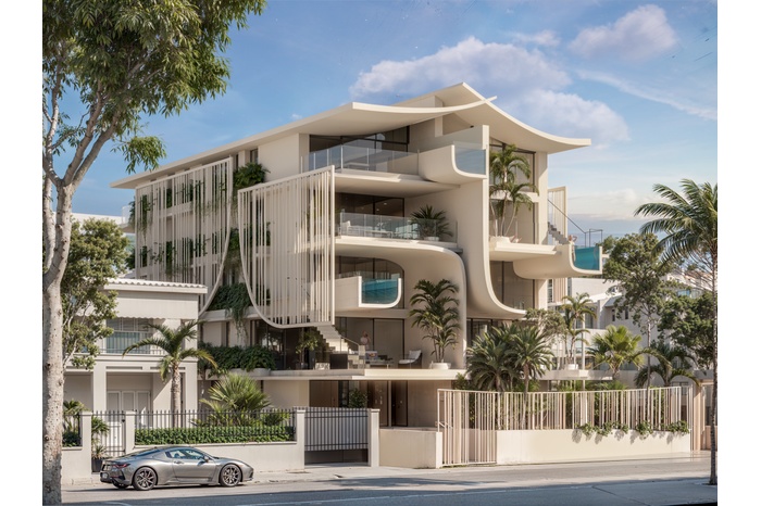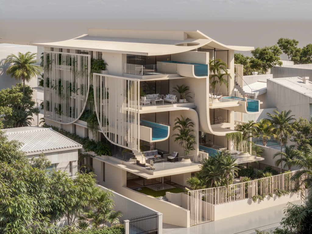 The architectural design offers a striking blend of organic curves and modern, straight lines, creating a visually captivating façade. Each floor flows seamlessly into the next, accentuated by lush greenery and private pools that enhance the luxurious feel of the building.