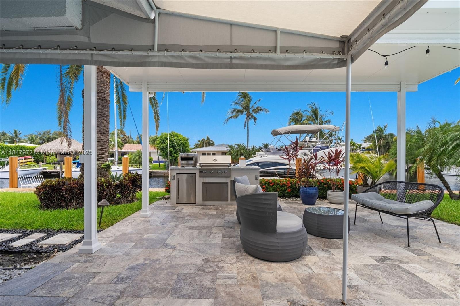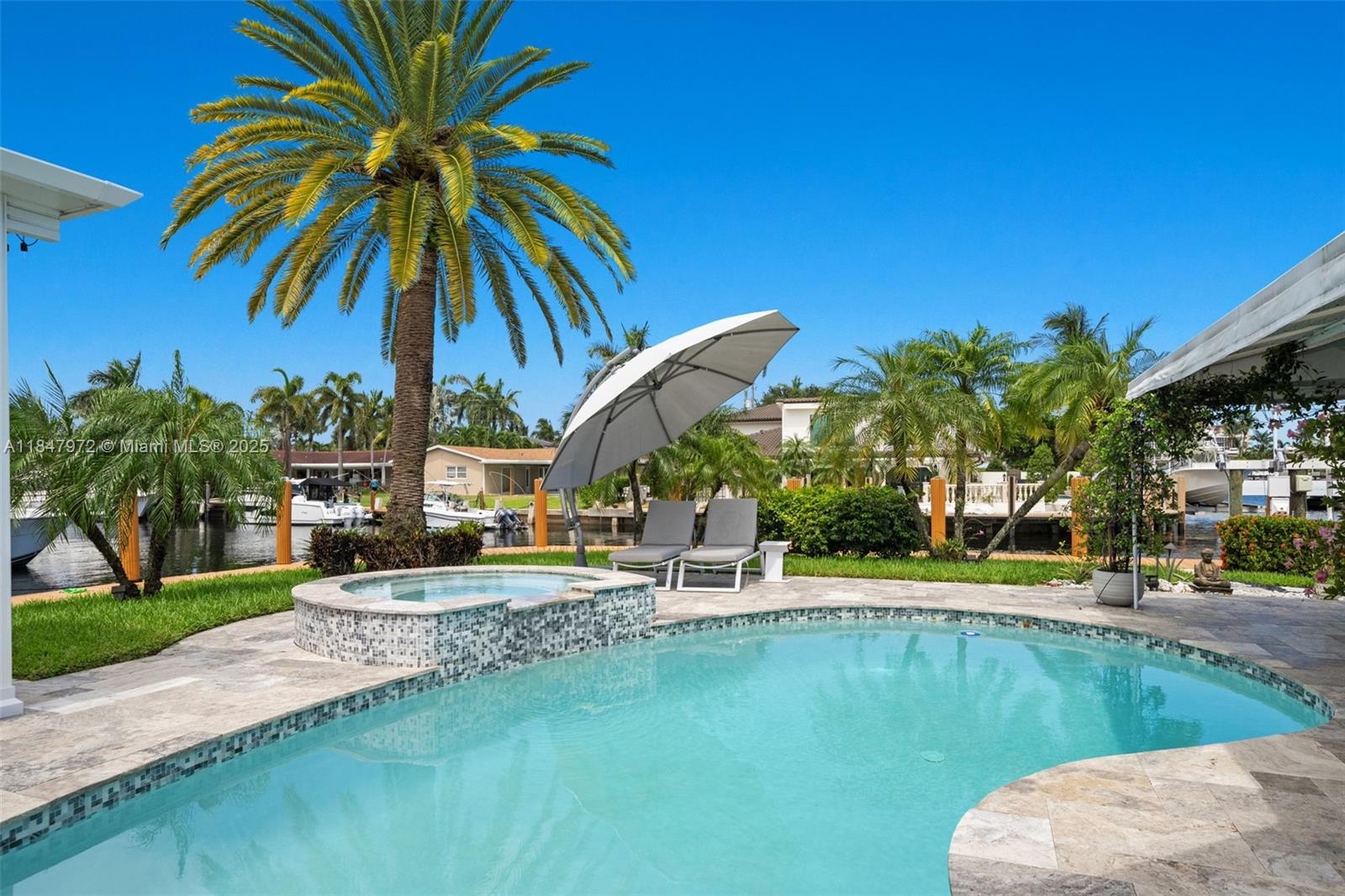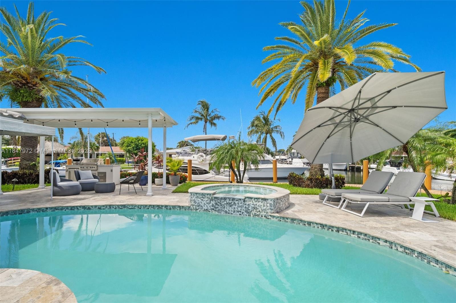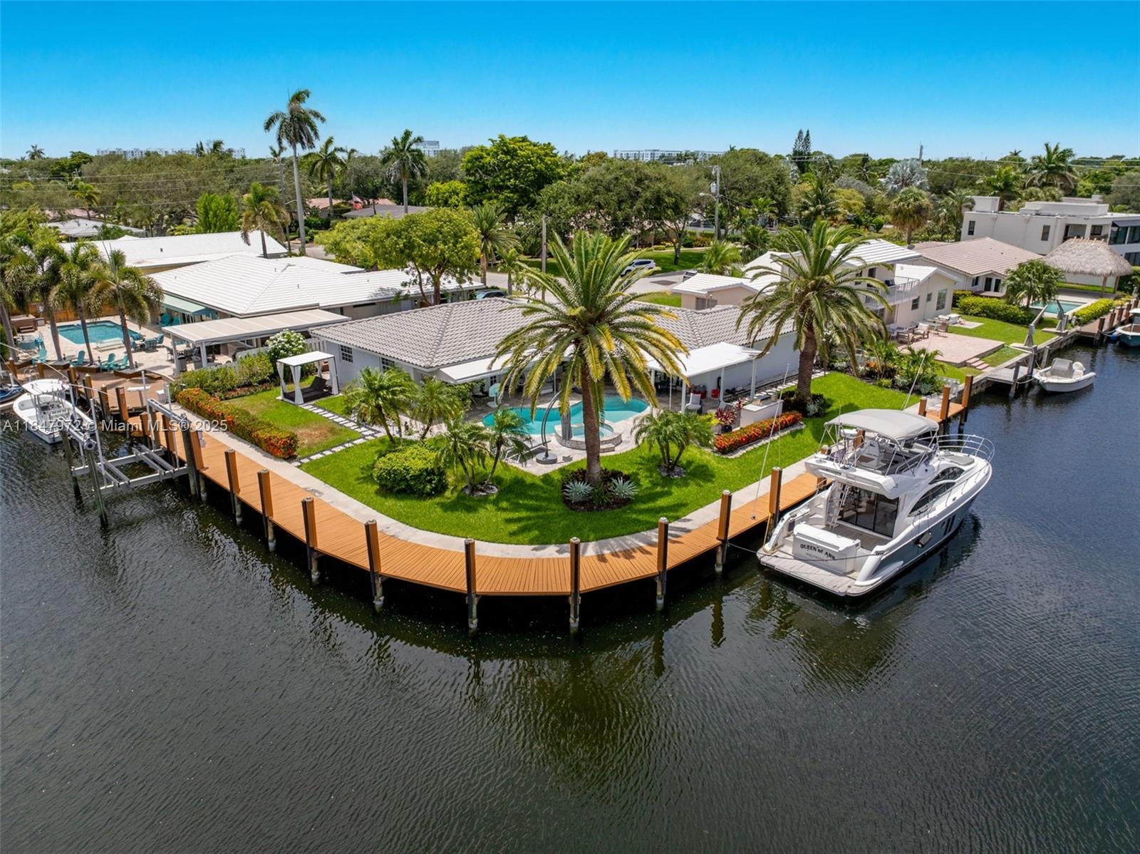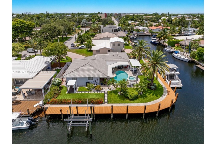 Elegant point-lot residence offering 196' of deep-water frontage with no fix bridges & captivating water views from every room. Thoughtfully remodeled w a split floor plan & refined finishes throughout. Features include a new roof, HVAC, natural gas Wolf stove & upgraded electric. Outdoor living shines w a new saltwater pool, spa, heater/chiller, new travertine deck, new 16,000 lb boat lift, new pergola & full built-in BBQ w fridge. Set on an expansive & beautifully positioned lot, this property offers abundant space for entertaining, relaxation & recreation—with distinct zones for poolside lounging, alfresco dining, grilling & shaded retreat under the pergola. There's room to personalize & create your own private oasis. Minutes to the beach, dining & the vibrant energy of Pompano Beach