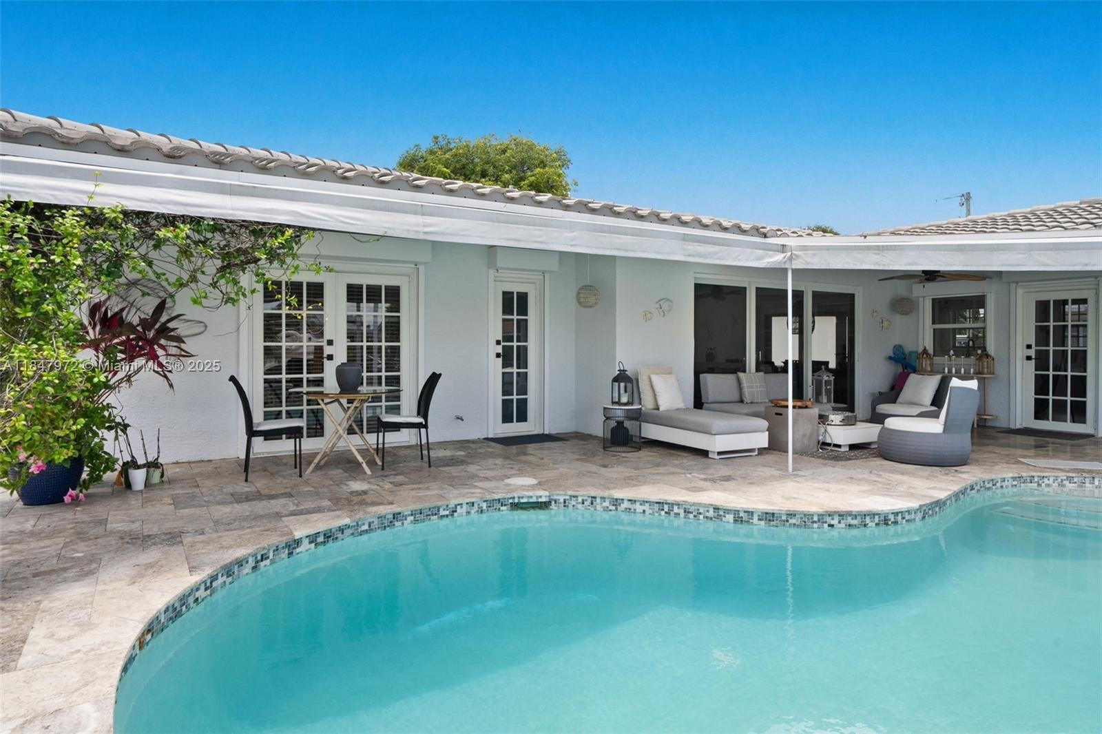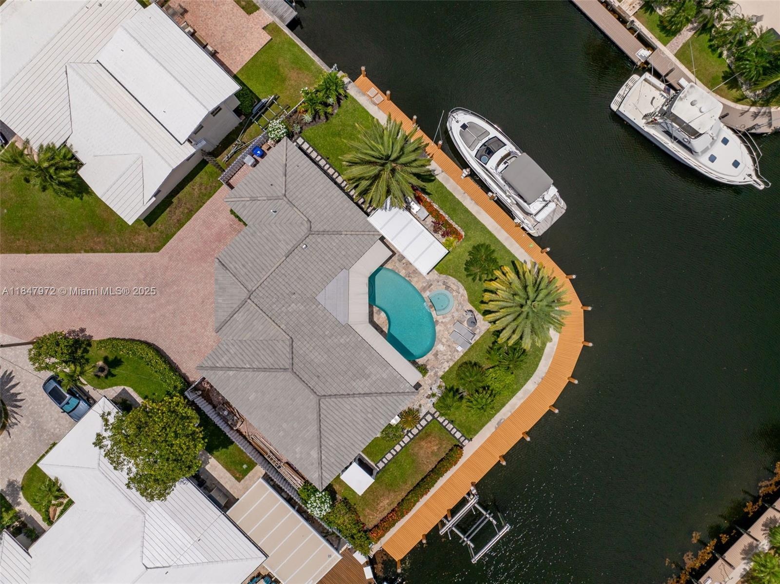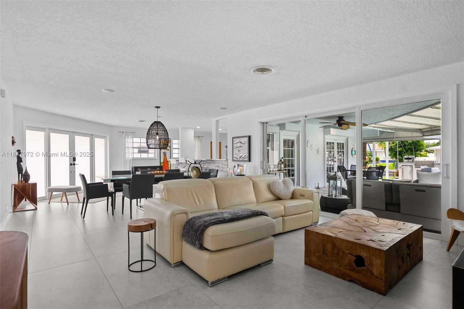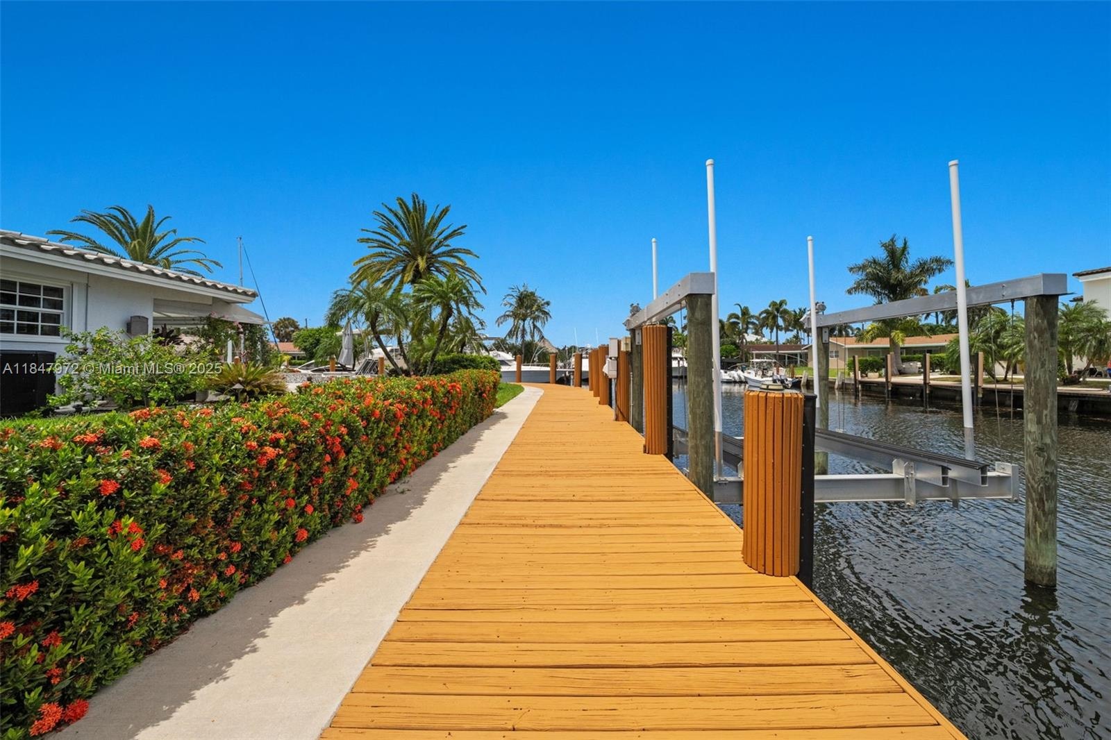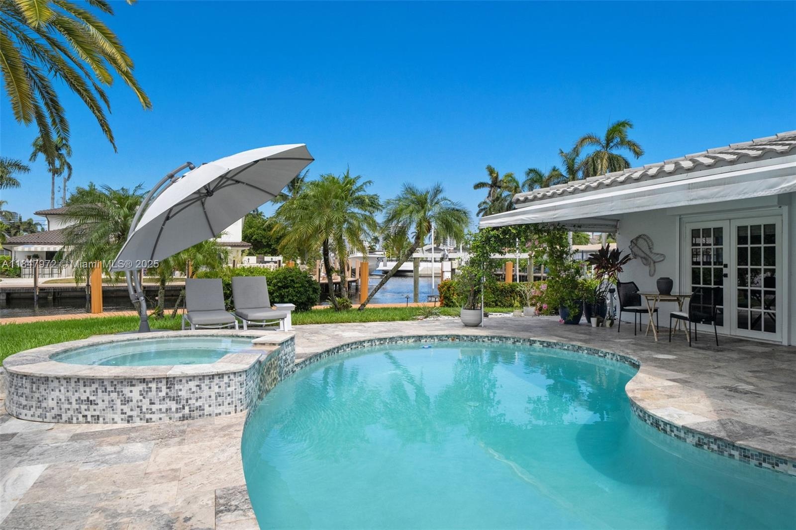 Elegant point-lot residence offering 196' of deep-water frontage with no fix bridges & captivating water views from every room. Thoughtfully remodeled w a split floor plan & refined finishes throughout. Features include a new roof, HVAC, natural gas Wolf stove & upgraded electric. Outdoor living shines w a new saltwater pool, spa, heater/chiller, new travertine deck, new 16,000 lb boat lift, new pergola & full built-in BBQ w fridge. Set on an expansive & beautifully positioned lot, this property offers abundant space for entertaining, relaxation & recreation—with distinct zones for poolside lounging, alfresco dining, grilling & shaded retreat under the pergola. There's room to personalize & create your own private oasis. Minutes to the beach, dining & the vibrant energy of Pompano Beach