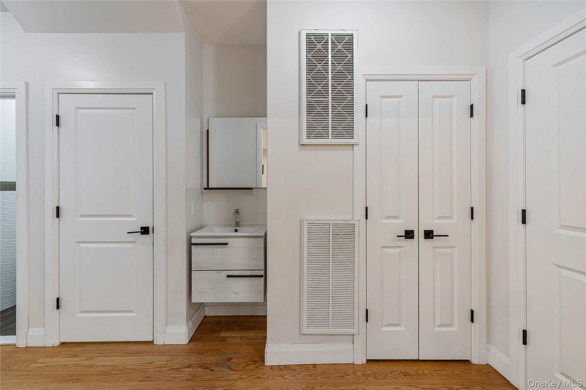 - Hallway with light wood-style floors and baseboards