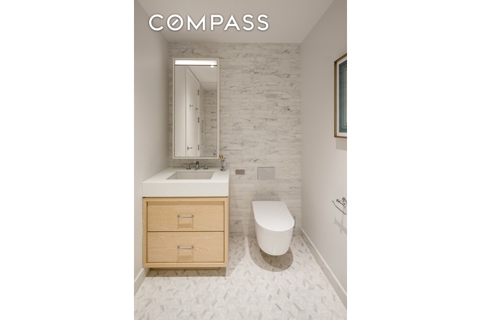 The oversized, south-facing primary suite offers open city views and an en-suite marble bath with radiant-heated floors, soaking tub, glass-enclosed shower, dual sink vanity, Waterworks fixtures, separate WC with Toto Neorest commode, and two oversized closets.
