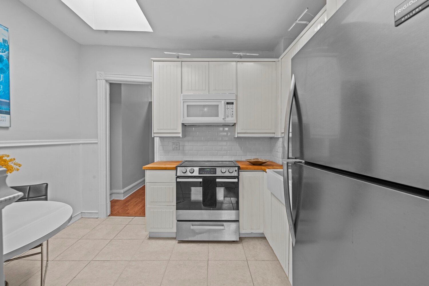 The expansive owner's duplex spans the garden and parlor levels, featuring two spacious bedrooms and a thoughtfully designed layout that highlights original details alongside tasteful contemporary upgrades. The kitchen opens to a private backyard.