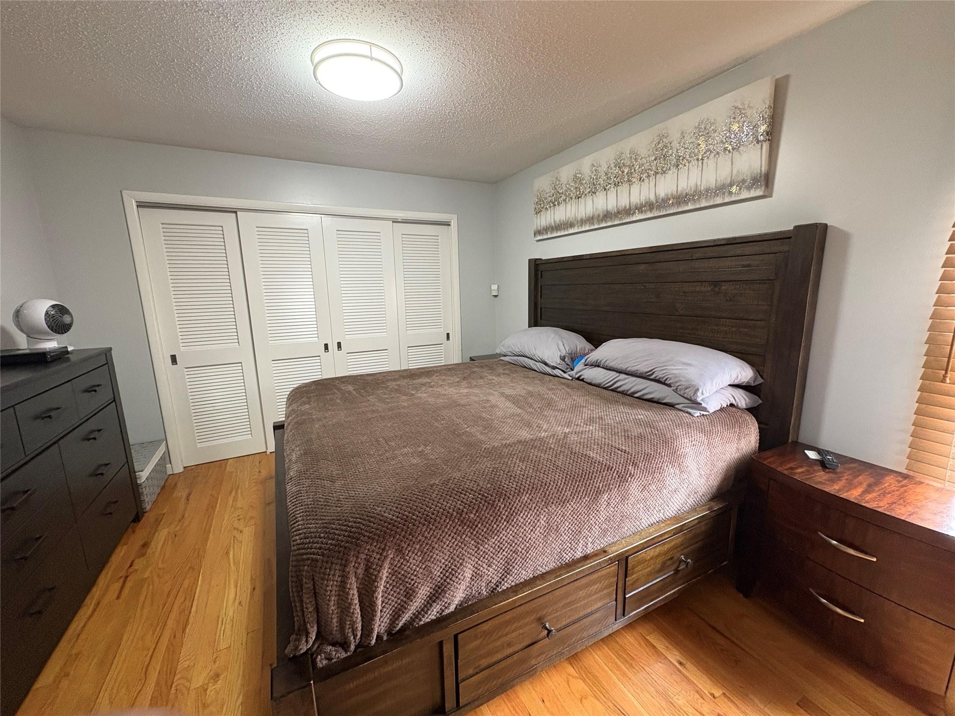 - Bedroom with a textured ceiling and wood finished floors