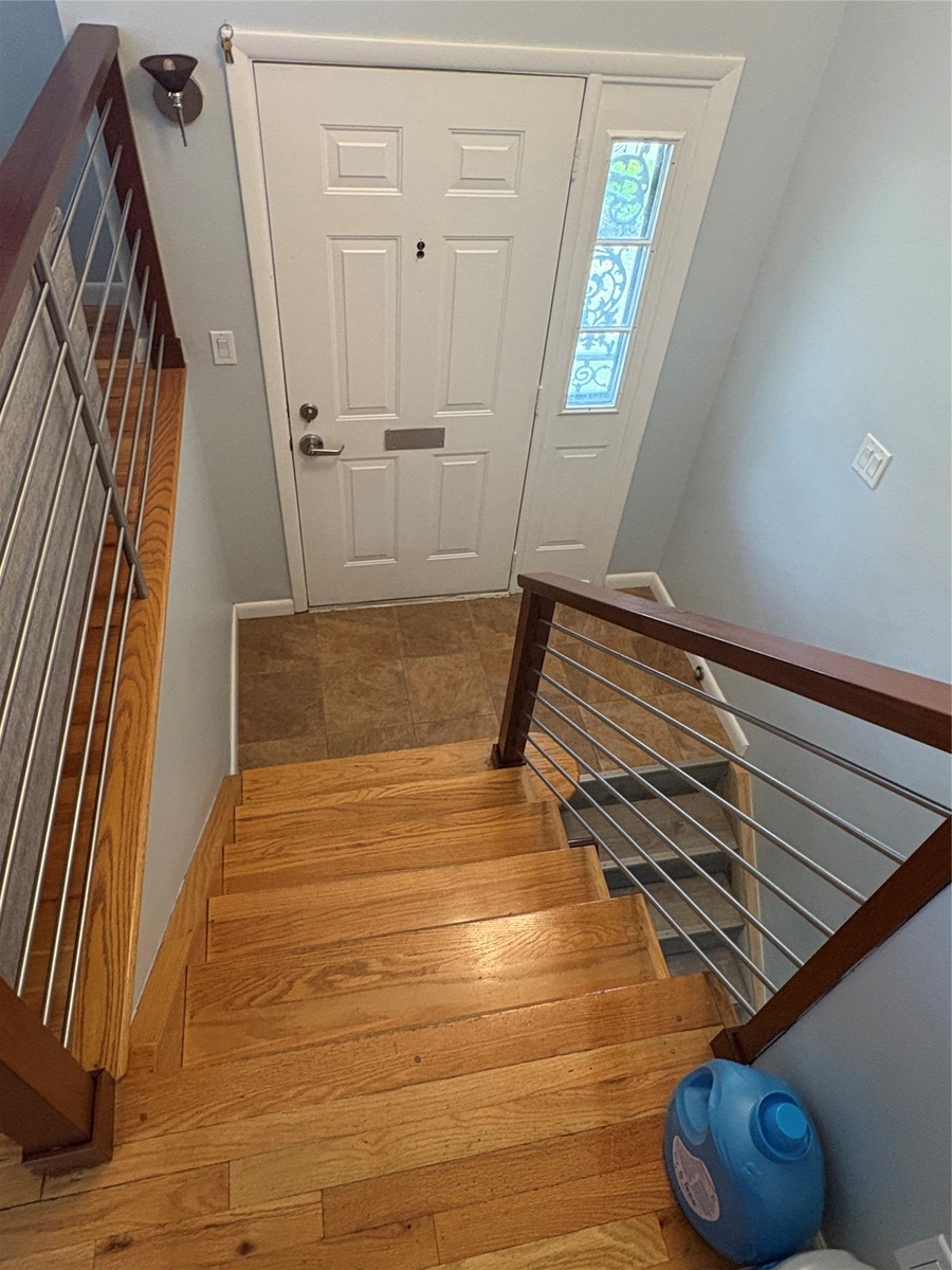- Staircase featuring baseboards and wood finished floors