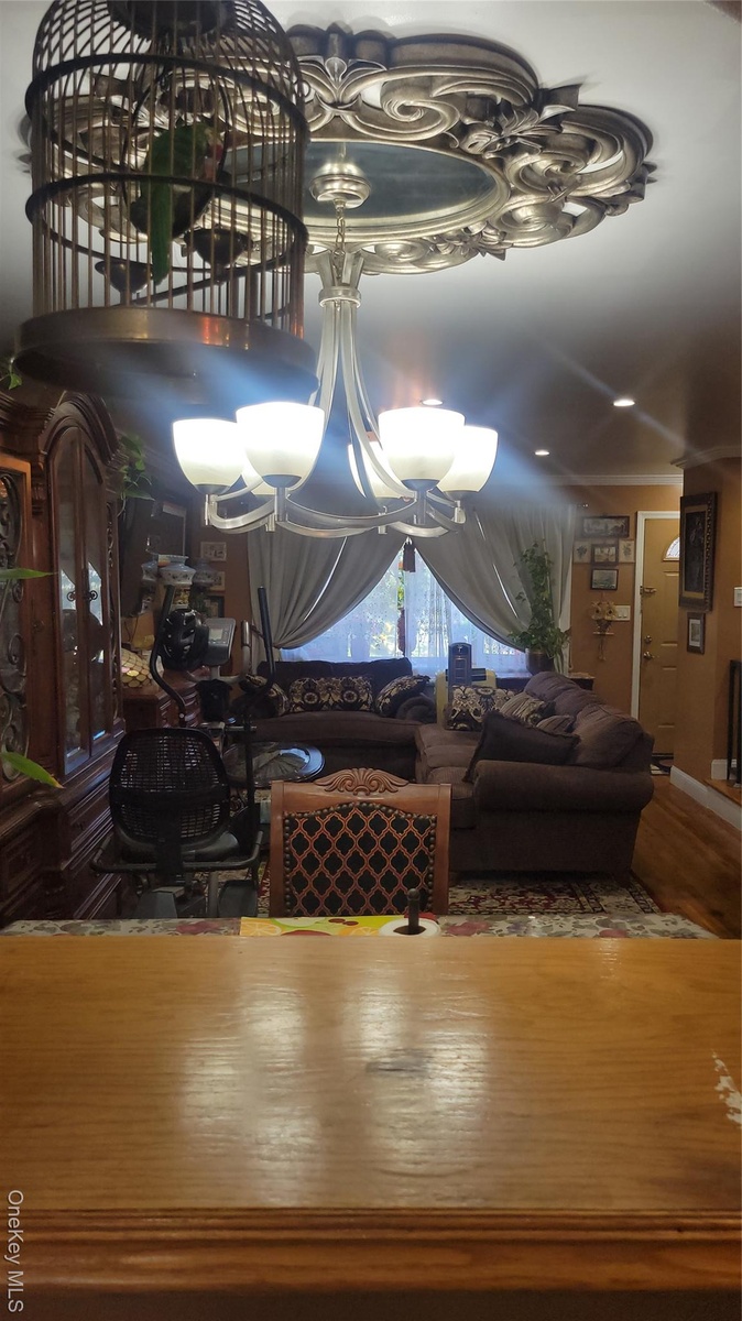 - Living room with a chandelier, crown molding, wood finished floors, and recessed lighting