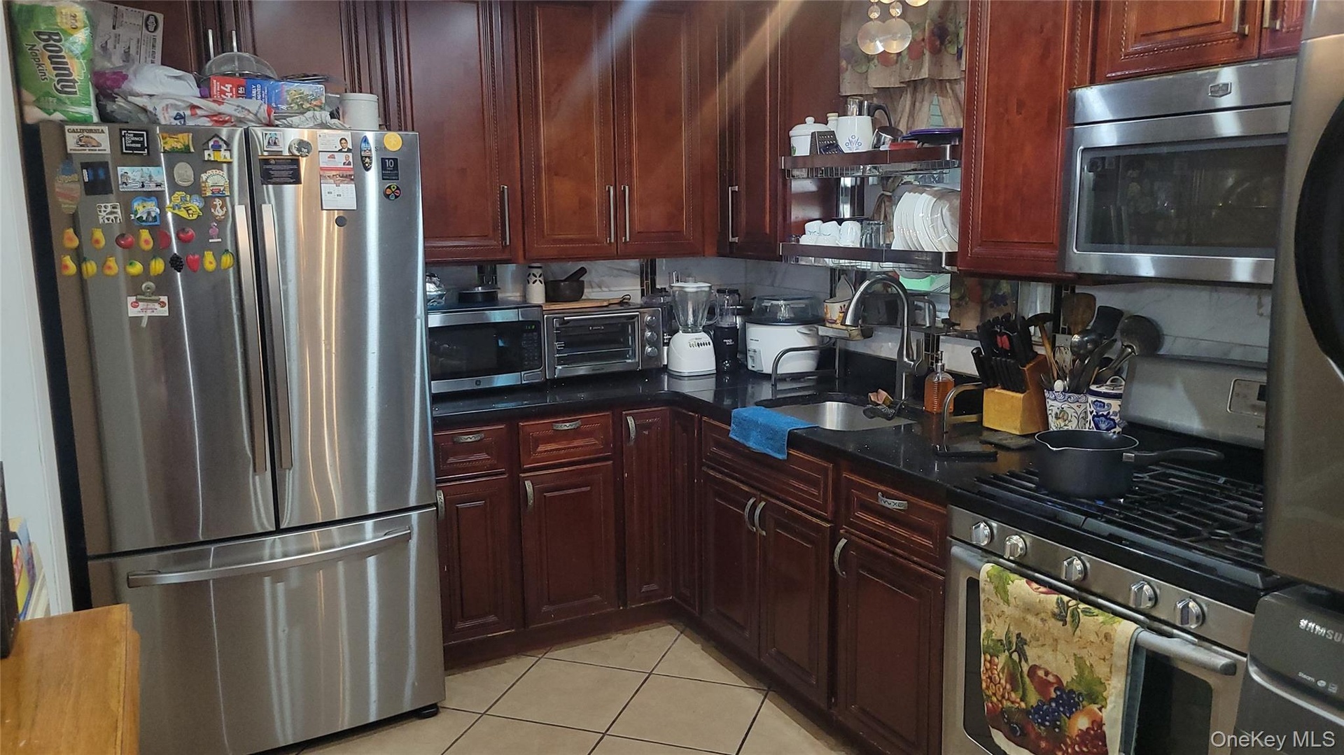 - Kitchen with appliances with stainless steel finishes, light tile patterned floors, dark stone countertops, and decorative backsplash
