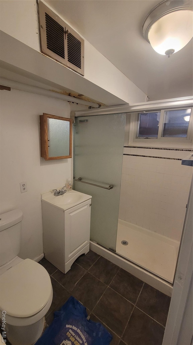 - Full Bathroom featuring a stall shower, vanity, and dark tile patterned floors