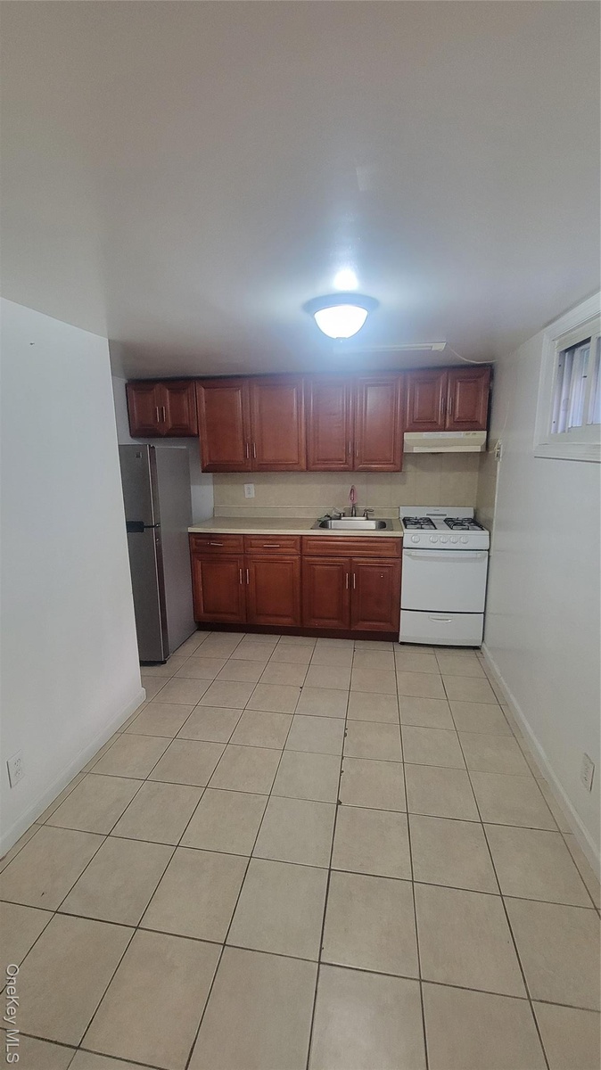 - Kitchen featuring dark brown cabinets, range, light tile patterned floors, black refrigerator, and light countertops
