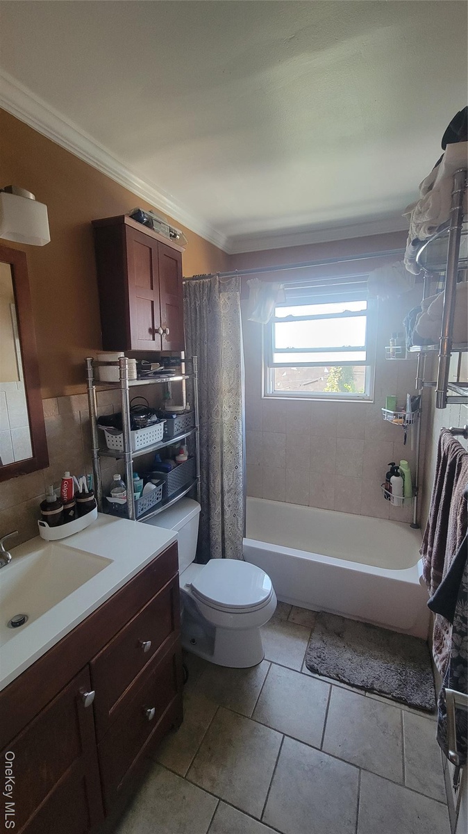 - Full bathroom featuring shower / bath combination with curtain, vanity, crown molding, and light tile patterned floors