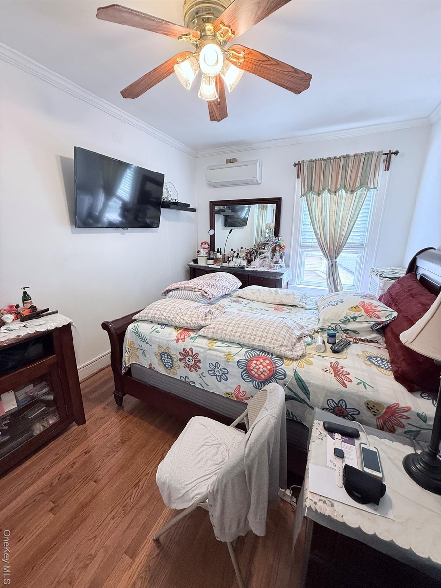 - Bedroom with crown molding, wood finished floors, a ceiling fan, and an AC wall unit