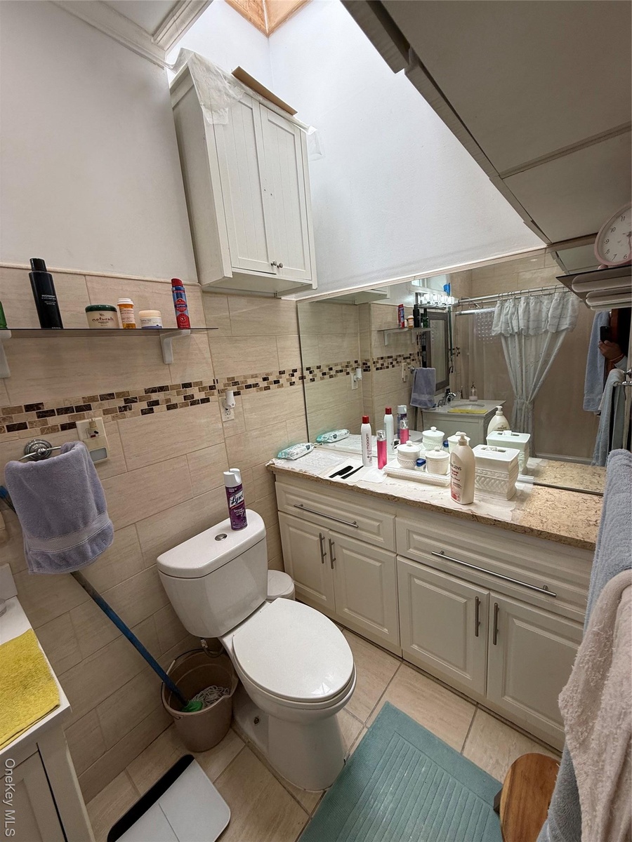 - Bathroom with vanity, tile walls, tile patterned flooring, and a shower