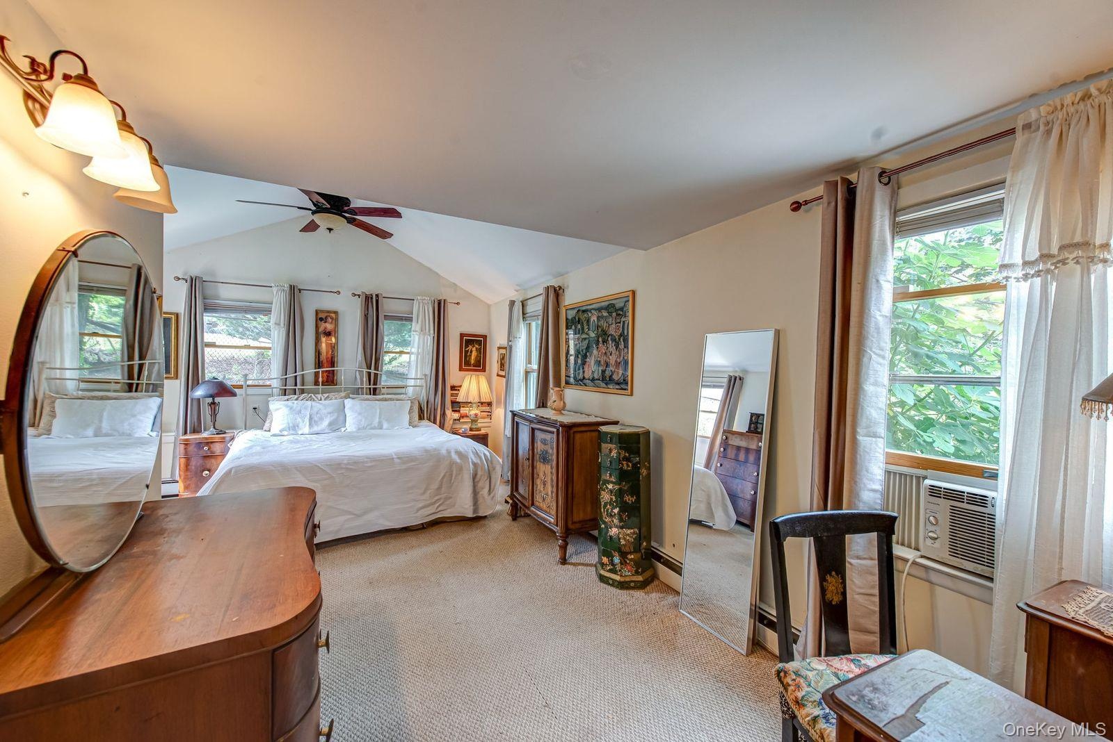 - Bedroom #2 with carpet floors, multiple windows, a baseboard heating unit, and a ceiling fan