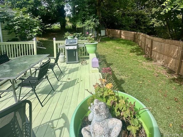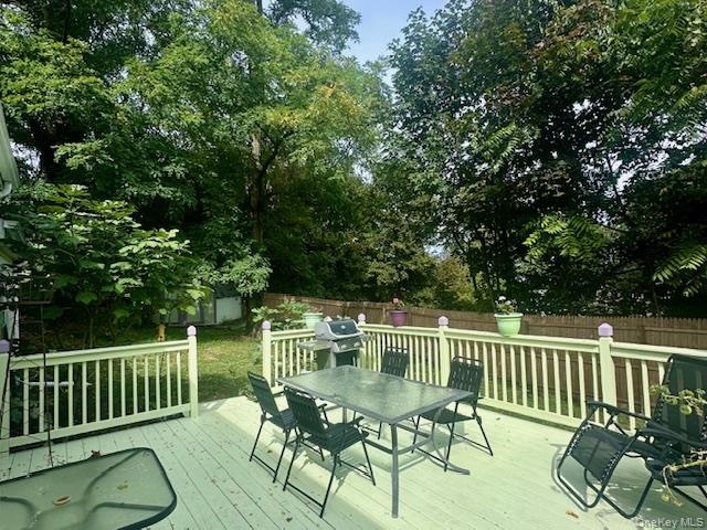 - Wooden terrace with outdoor dining space, a fenced backyard, and area for grilling