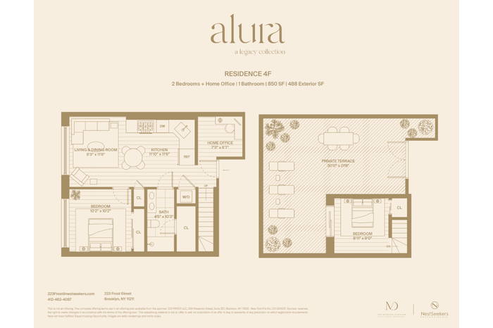 Welcome to Penthouse F at Alura, an extraordinary two-bedroom + home office duplex that offers elevated living, refined design, and a generous private terrace in the heart of East Williamsburg. Situated on the top floor of 223 Frost Street, this one-of-a-kind residence spans two stylish levels, blending indoor elegance with expansive outdoor space for a truly elevated Brooklyn lifestyle.
