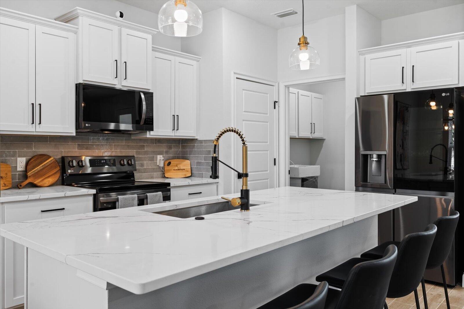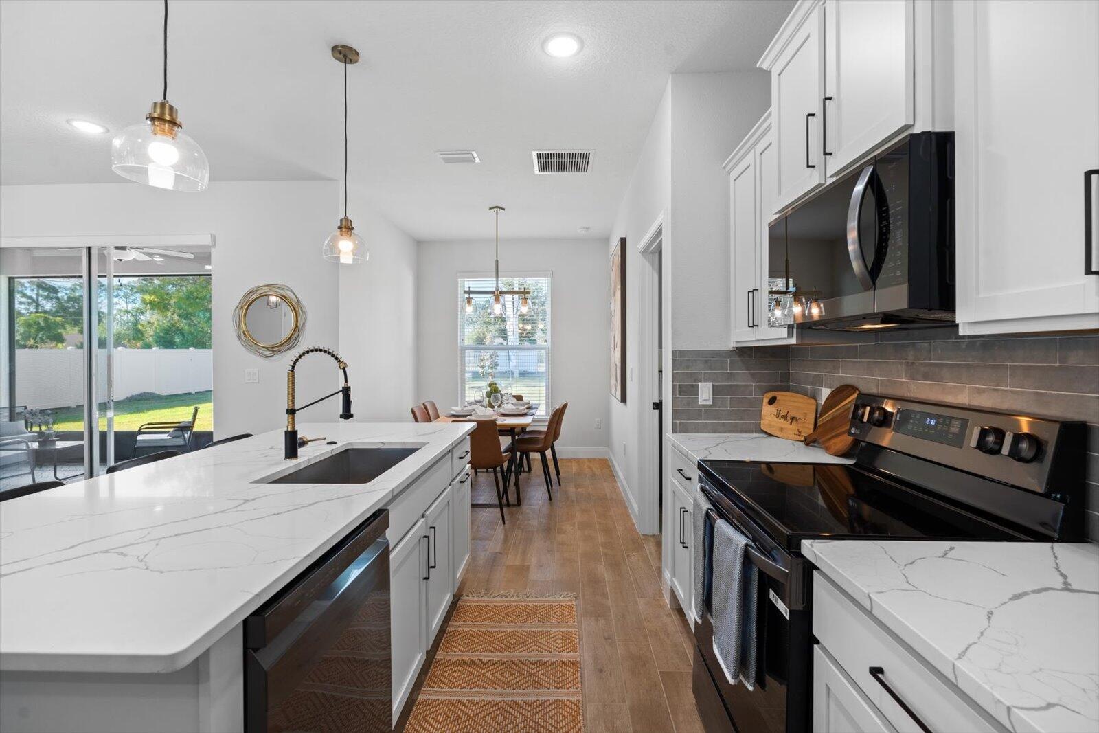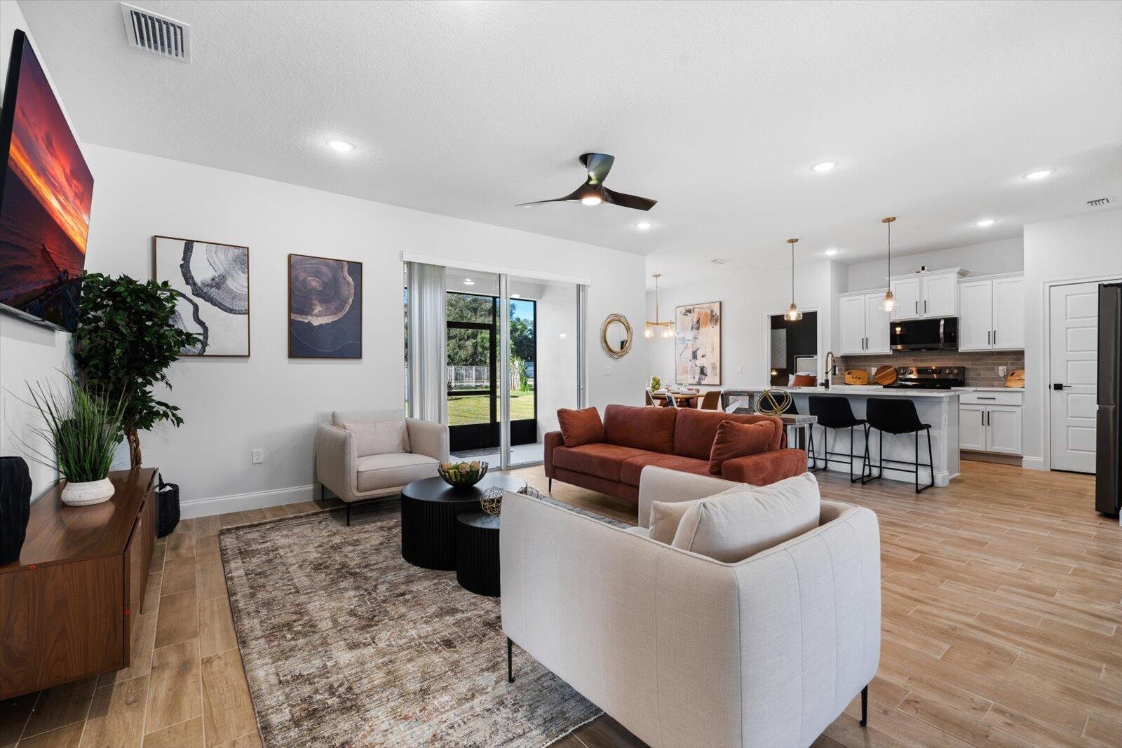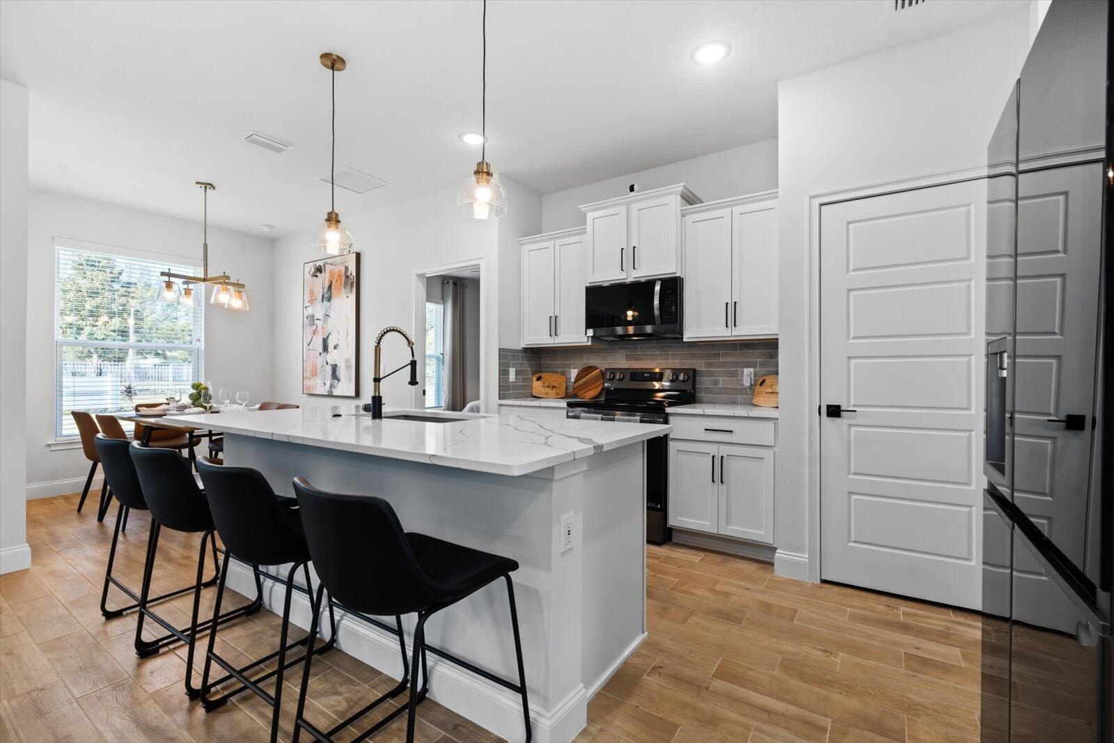 DescriptionUP TO $15,000 BUILDER INCENTIVES! NO ORIGINATION OR APPLICATION FEES with our approved lender + $31,000 IN UPGRADES INCLUDED! This stunning new construction on an oversized corner lot offers elegance, comfort, and style. Features include an 8' designer front door, tile throughout, 9'4'' ceilings, and an 8' sliding glass door to a covered lanai. Natural light fills the open floor plan. The kitchen boasts shaker cabinets, veined quartz counters, backsplash, and matte black stainless appliances. Baths feature matte black faucets, bronze fixtures, and tiled walls. Riverside-style doors and designer lighting add refined touches. Photos shown are of the Model at 182 Bayside Dr. Open daily 11AM-5PM.