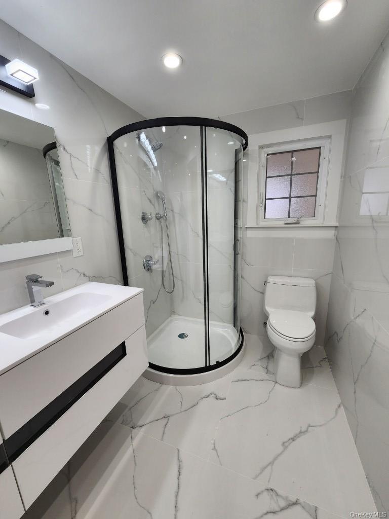 - Bathroom featuring a marble finish shower, marble finish flooring, and recessed lighting