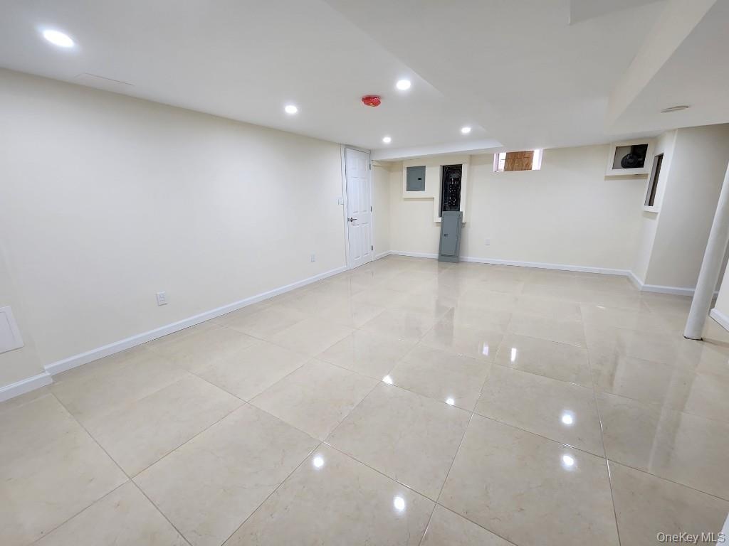 - Finished below grade area featuring recessed lighting, light tile patterned flooring, and electric panel