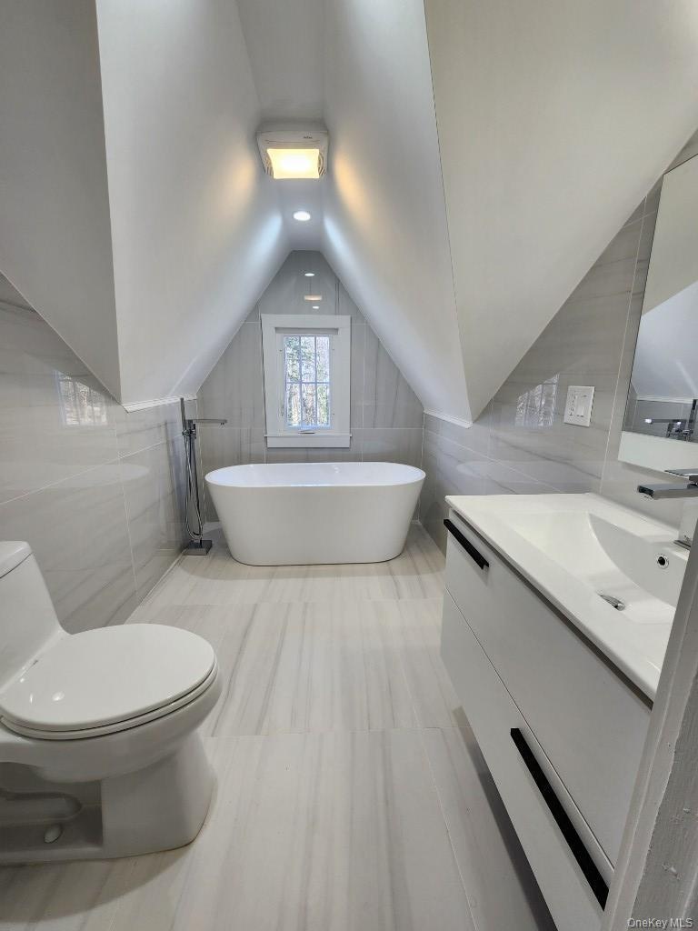 - Full bath with vanity, a soaking tub, tile walls, and vaulted ceiling