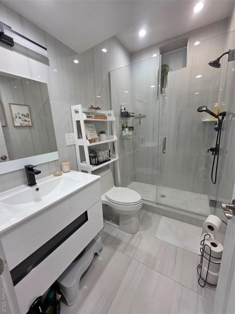 - Full bathroom featuring double vanity, tile patterned floors, a stall shower, tile walls, and recessed lighting