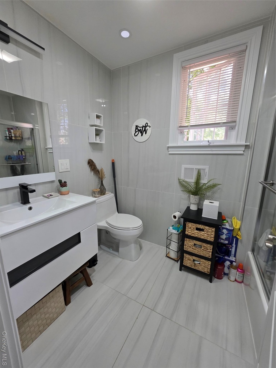 - Bathroom featuring tile walls, vanity, light tile patterned flooring, and recessed lighting