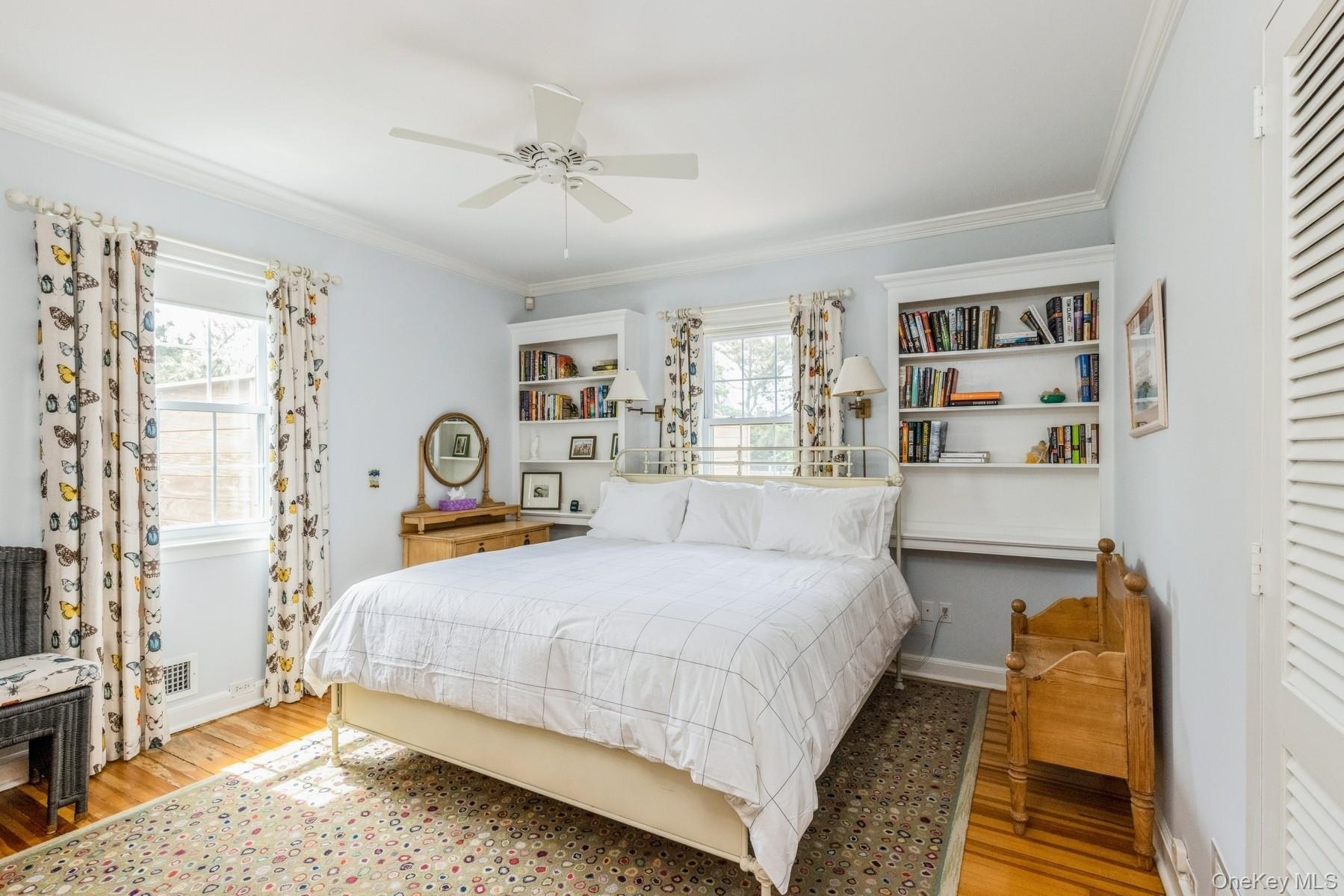 - Windows and french doors provide plenty of natural light and bay views, wainscoting, coffered ceiling