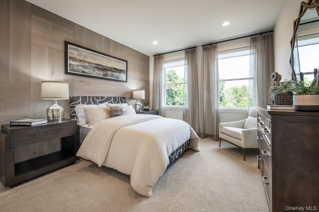 - Bedroom featuring wooden walls, light carpet, and recessed lighting