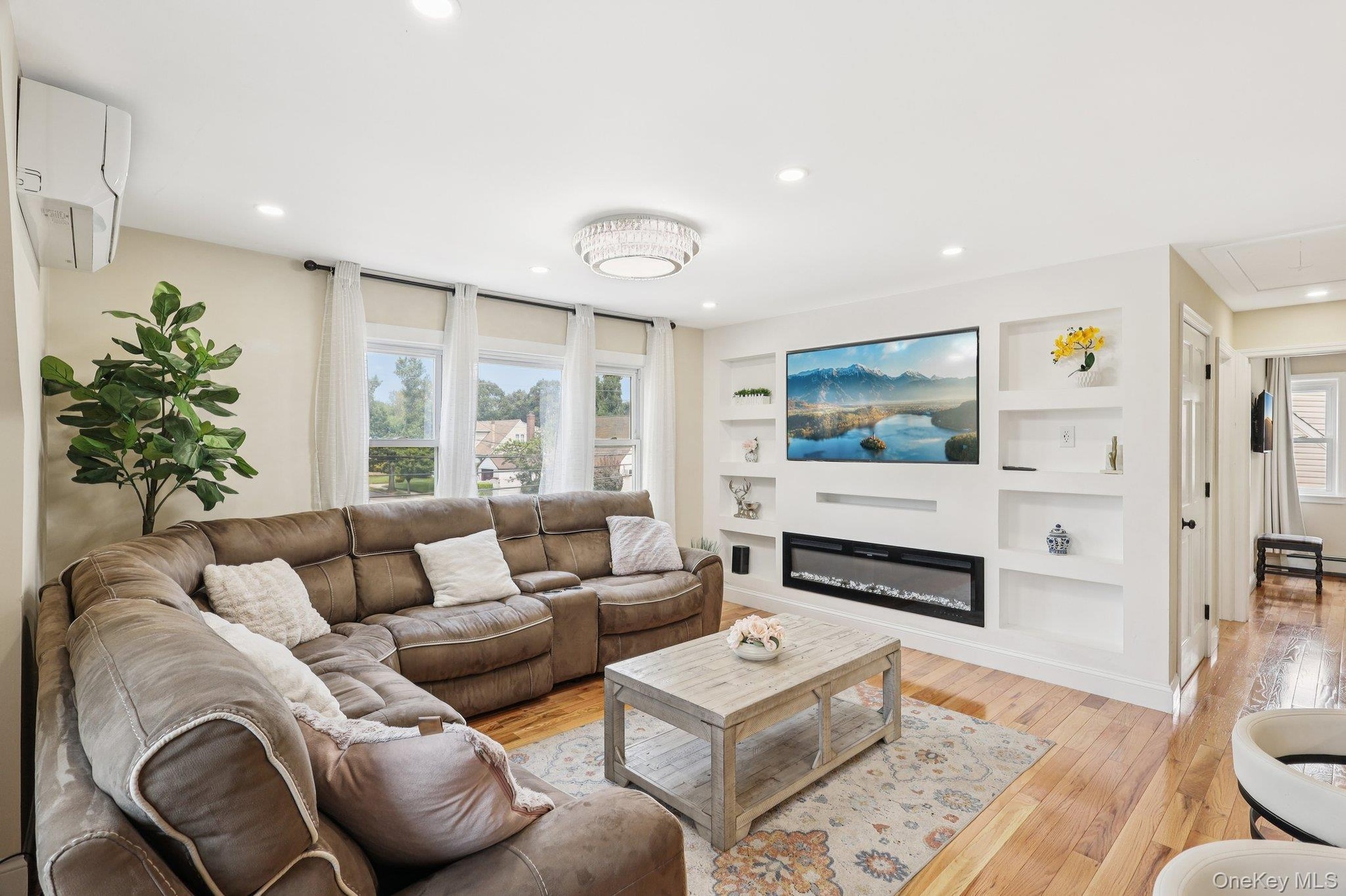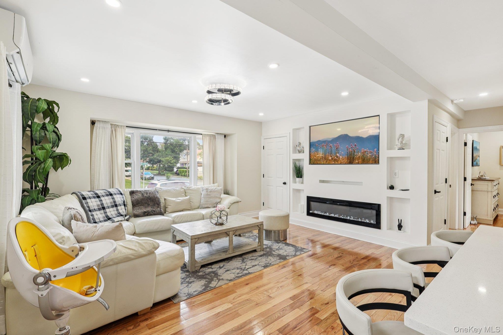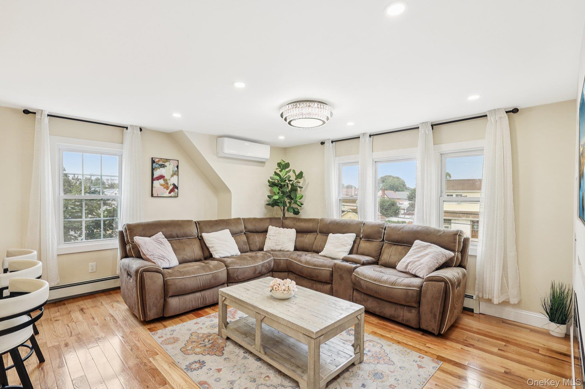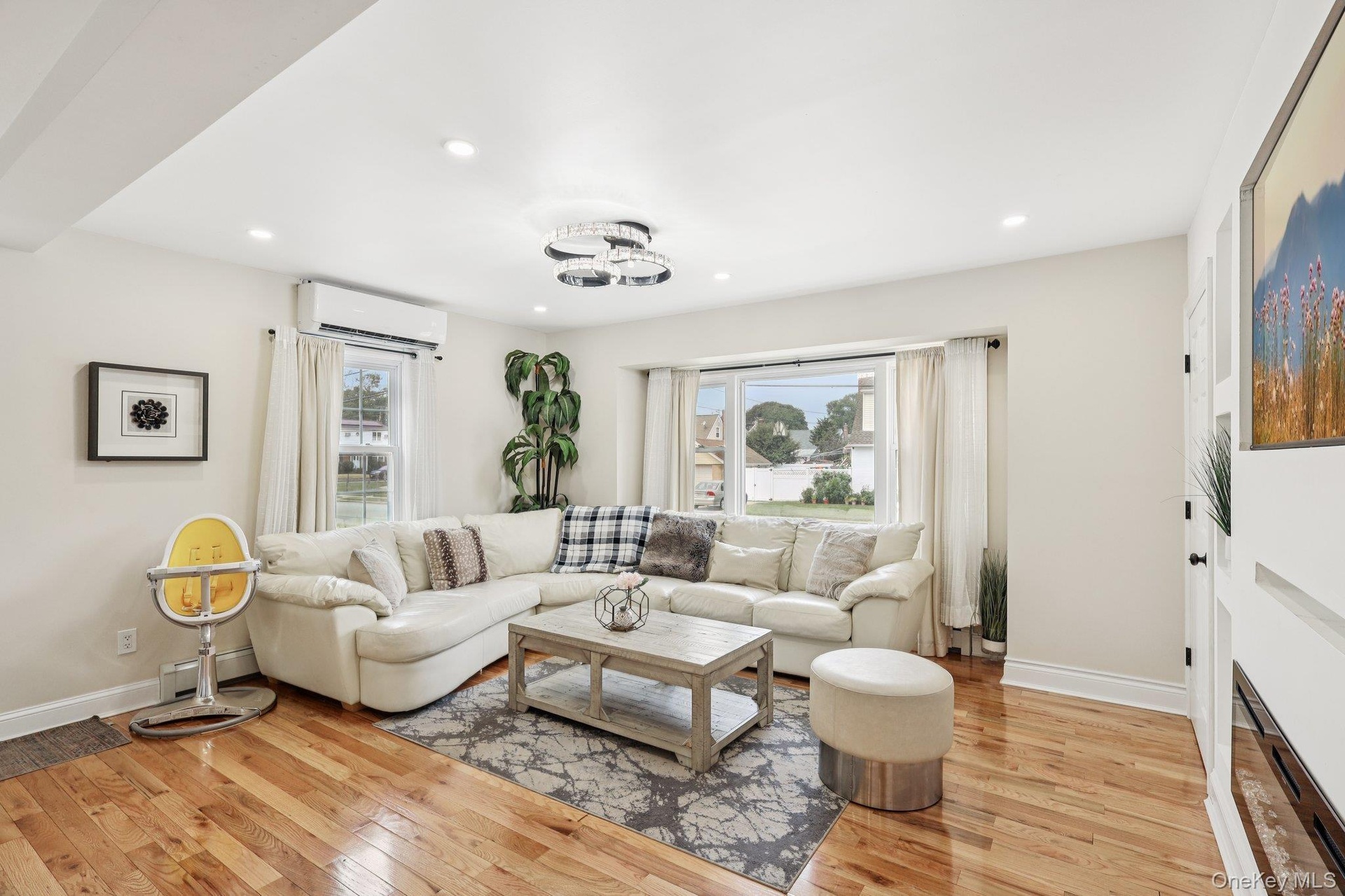 - Living area with plenty of natural light, recessed lighting, light wood-style floors, and a wall mounted air conditioner