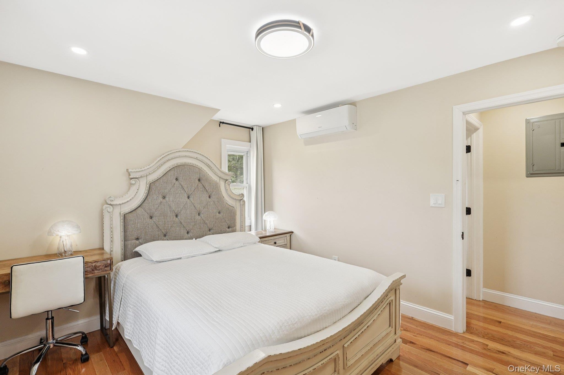 - Bedroom with electric panel, light wood-style floors, recessed lighting, and an AC wall unit
