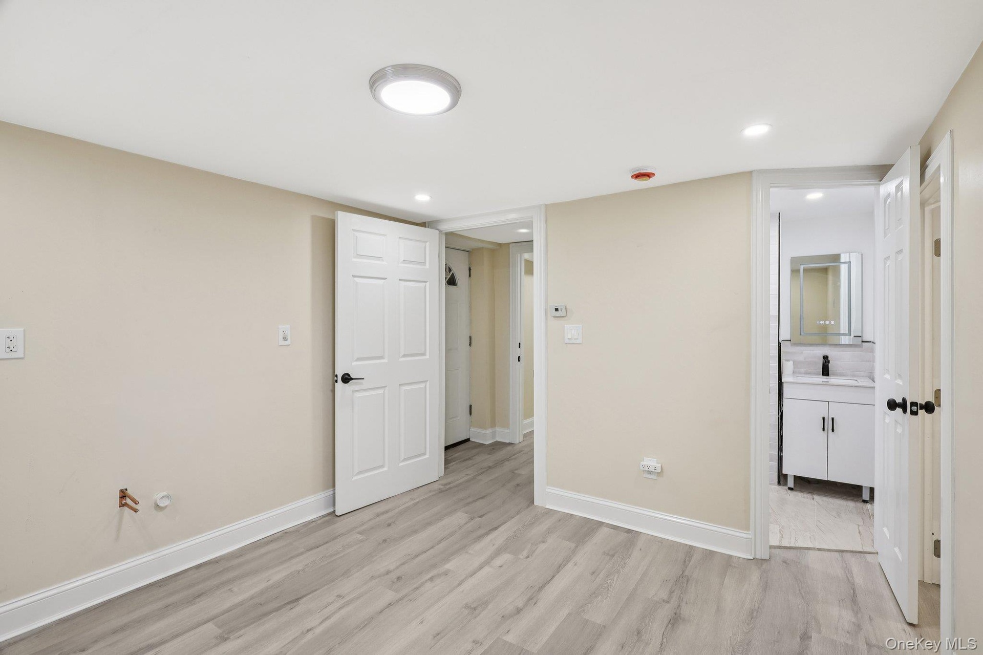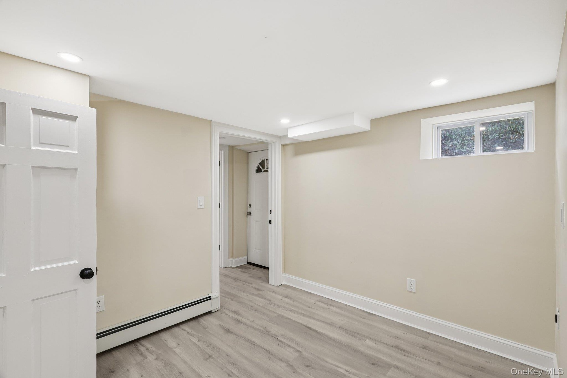 - Below grade area featuring light wood-type flooring, baseboard heating, and recessed lighting